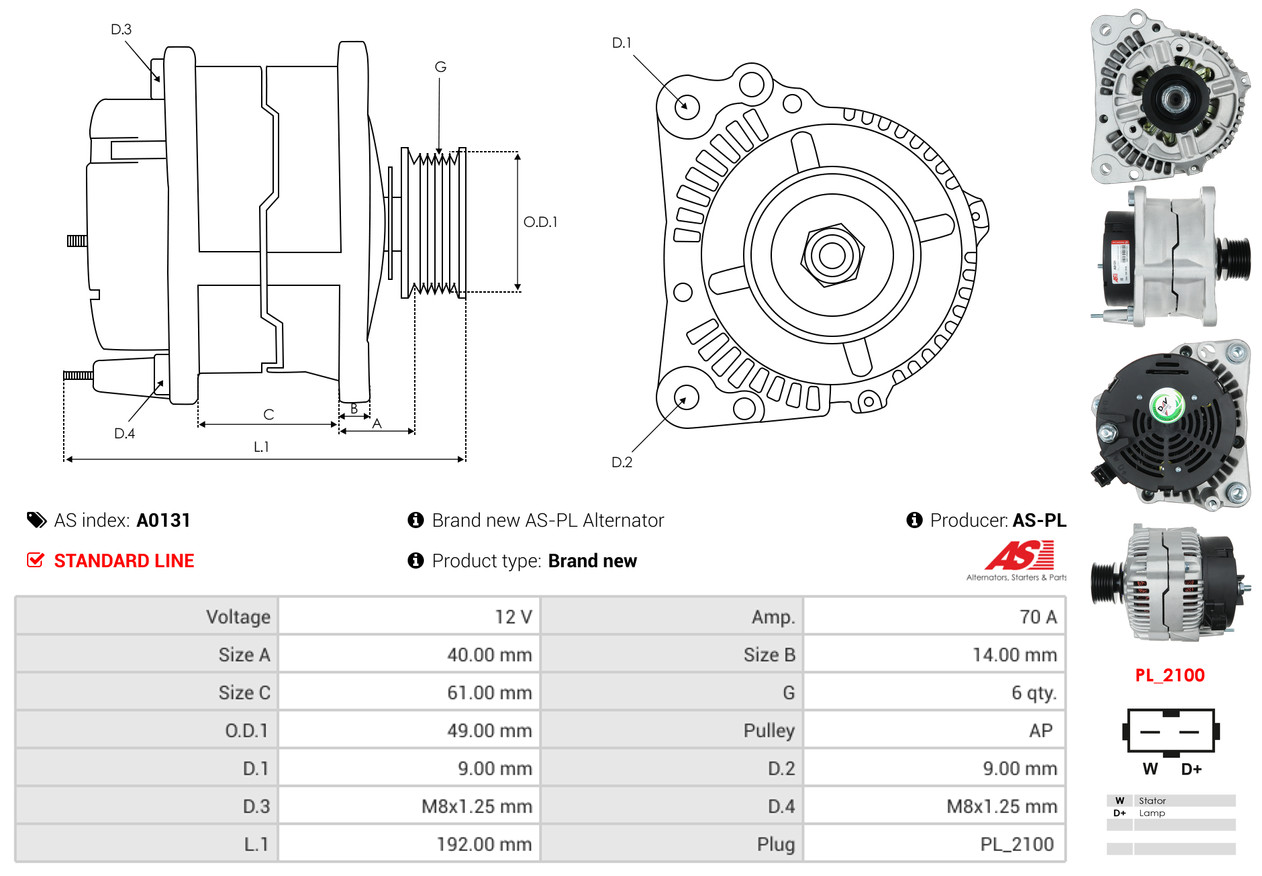 AS-PL je renomovaná evropská značka se sídlem v Polsku, která se specializuje na výrobu a distribuci startérů, alternátorů a jejich komponentů. Společnost vznikla v roce 1992 a dnes dodává více než 20 000 různých produktů do více než 100 zemí světa. AS-PL nabízí jak kompletní jednotky, tak i náhradní díly a komponenty pro opravy. [Více zde]