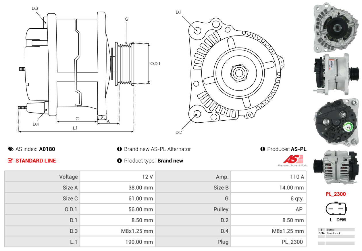 AS-PL je renomovaná evropská značka se sídlem v Polsku, která se specializuje na výrobu a distribuci startérů, alternátorů a jejich komponentů. Společnost vznikla v roce 1992 a dnes dodává více než 20 000 různých produktů do více než 100 zemí světa. AS-PL nabízí jak kompletní jednotky, tak i náhradní díly a komponenty pro opravy. [Více zde]