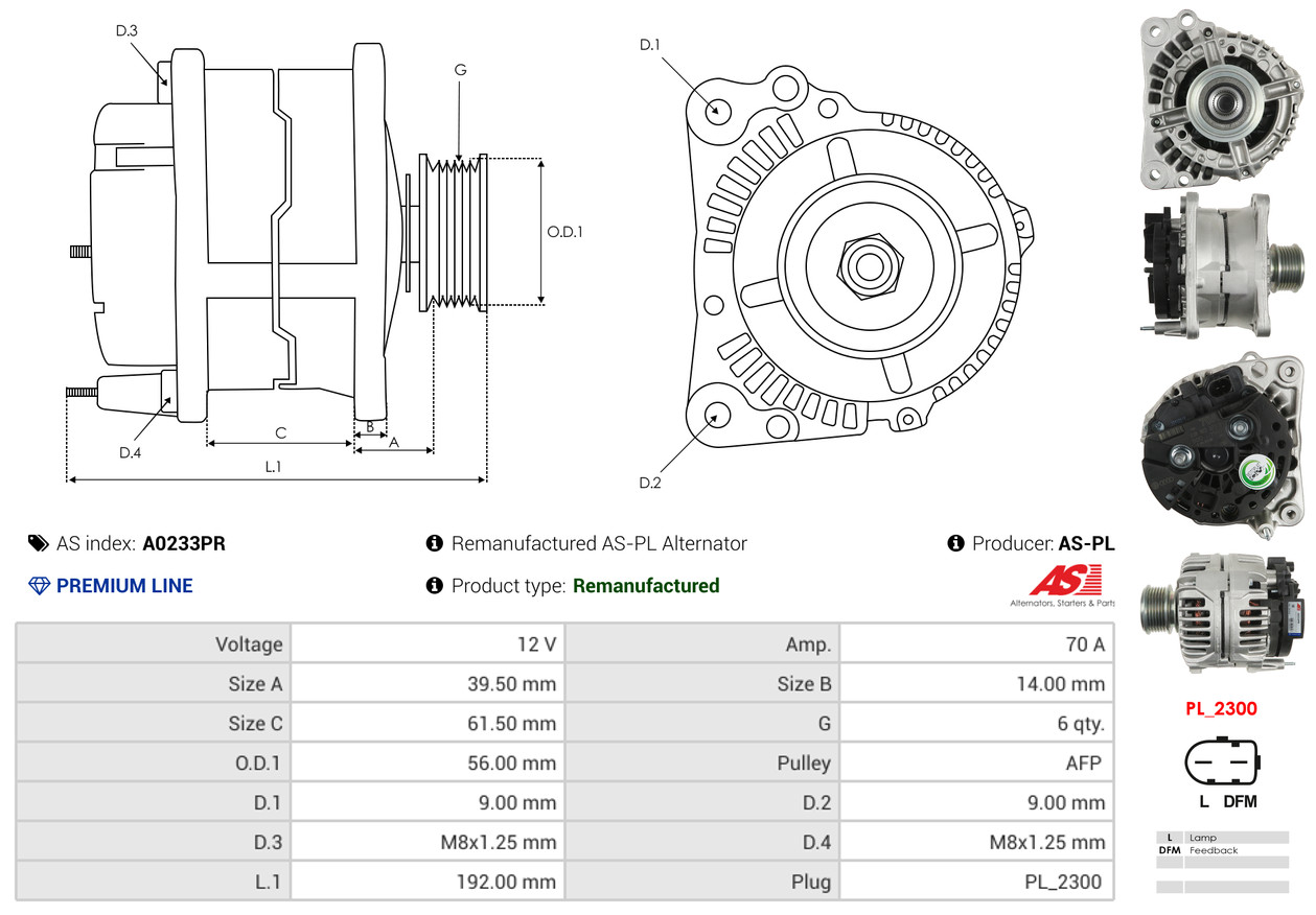 AS-PL je renomovaná evropská značka se sídlem v Polsku, která se specializuje na výrobu a distribuci startérů, alternátorů a jejich komponentů. Společnost vznikla v roce 1992 a dnes dodává více než 20 000 různých produktů do více než 100 zemí světa. AS-PL nabízí jak kompletní jednotky, tak i náhradní díly a komponenty pro opravy. [Více zde]