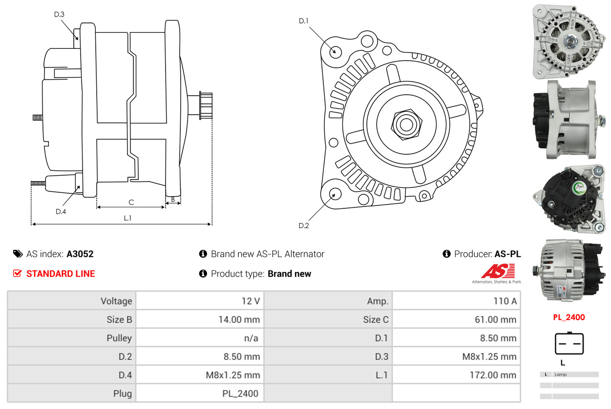 AS-PL je renomovaná evropská značka se sídlem v Polsku, která se specializuje na výrobu a distribuci startérů, alternátorů a jejich komponentů. Společnost vznikla v roce 1992 a dnes dodává více než 20 000 různých produktů do více než 100 zemí světa. AS-PL nabízí jak kompletní jednotky, tak i náhradní díly a komponenty pro opravy. [Více zde]
