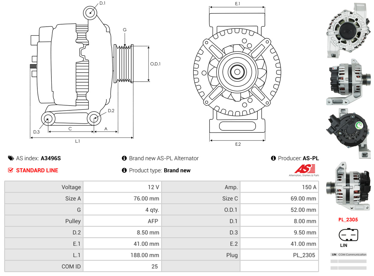 AS-PL je renomovaná evropská značka se sídlem v Polsku, která se specializuje na výrobu a distribuci startérů, alternátorů a jejich komponentů. Společnost vznikla v roce 1992 a dnes dodává více než 20 000 různých produktů do více než 100 zemí světa. AS-PL nabízí jak kompletní jednotky, tak i náhradní díly a komponenty pro opravy. [Více zde]