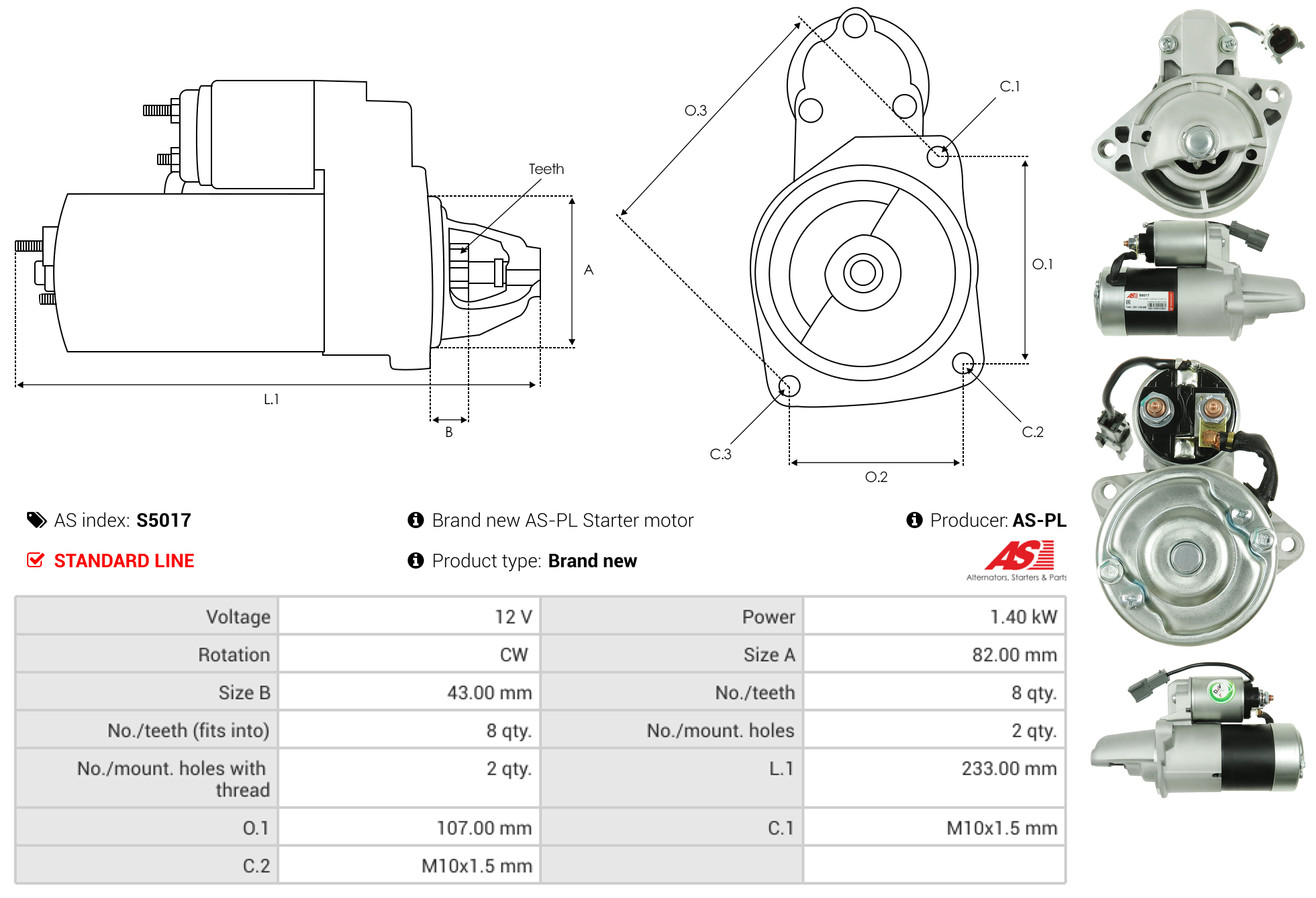 AS-PL je renomovaná evropská značka se sídlem v Polsku, která se specializuje na výrobu a distribuci startérů, alternátorů a jejich komponentů. Společnost vznikla v roce 1992 a dnes dodává více než 20 000 různých produktů do více než 100 zemí světa. AS-PL nabízí jak kompletní jednotky, tak i náhradní díly a komponenty pro opravy.