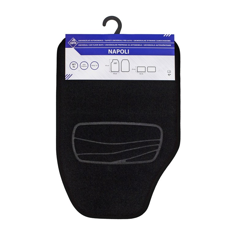 Univerzální textilní autokoberce NAPOLI jsou skvělým řešením pro každého, kdo chce ochránit podlahu svého vozu a zároveň přidat do interiéru atraktivní a funkční prvek. Koberce jsou navrženy pro snadnou montáž a pasují do většiny osobních automobilů, díky čemuž se stanou univerzální volbou pro širokou škálu vozidel. Dodávají se v 4 ks balení, což zahrnuje 2 přední a 2 zadní kusy, které zajistí kompletní ochranu podlahy v celém vozidle. Vysoká praktičnost a snadná údržbaKoberce NAPOLI jsou vyrobeny z kvalitního textilního materiálu, konkrétně polyesteru, což jim dodává dlouhou životnost a odolnost proti opotřebení. Díky použití tohoto materiálu jsou koberce nejen pevné a odolné, ale také velmi snadné na údržbu. Lze je jednoduše čistit vodou nebo běžnými čistícími prostředky, což znamená, že je budete moci pravidelně udržovat v perfektním stavu bez zbytečných komplikací. Stačí je otřít nebo opláchnout, aby opět vypadaly jako nové. Odolnost a bezpečnost při jízděKoberce jsou vybaveny zdrsněním na podložní části v oblasti pedálů, což zajišťuje vysokou stabilitu a bezpečnost při jízdě. Tento design pomáhá zamezit sklouznutí nohou, což je zvláště důležité při intenzivním používání pedálů, a zajišťuje pevný a bezpečný kontakt s podlahou vozu. Zdrsněná plastová plocha na spodní straně koberců dále přispívá k jejich vysoké přilnavosti k podlaze, což znamená, že se koberce nebudou posouvat a zůstanou pevně na svém místě, čímž zabraňují nežádoucímu pohybu a prodření. Stylový vzhled a univerzální použitíKoberce NAPOLI jsou navrženy tak, aby pasovaly do většiny běžných osobních automobilů, a to díky univerzální velikosti. To znamená, že je snadno nainstalujete i do vozidel různých značek a modelů. Specifikace: Materiál: Polyester (textil) – odolný, snadno udržovatelný a dlouhotrvající Polymer – poskytuje vysokou přilnavost k podlaze a chrání koberce proti skluzu Rozměry: Přední kusy: 43 x 65 cm  Zadní kusy: 42 x 29 cm Hmotnost: 1,2 kg  Výhody: Univerzální velikost pro většinu osobních automobilů Snadná údržba – čištění vodou a běžnými čisticími prostředky Zdrsněný povrch na spodní straně pro zamezení skluzu a prodření Odolnost proti opotřebení a dlouhá životnost díky kvalitnímu materiálu Praktický a funkční design, který zajišťuje ochranu a stabilitu   Závěr:Autokoberce NAPOLI jsou ideální volbou pro každého, kdo chce ochranu pro podlahu svého vozu, aniž by obětoval styl nebo pohodlí. Díky kvalitnímu materiálu, snadné údržbě a designovým prvkům, které zabraňují skluzu a opotřebení, jsou tyto koberce praktickým a funkčním doplňkem pro každodenní použití. Přidají vašemu vozidlu nejen ochranu, ale také praktický a moderní vzhled, který bude dělat dojem.