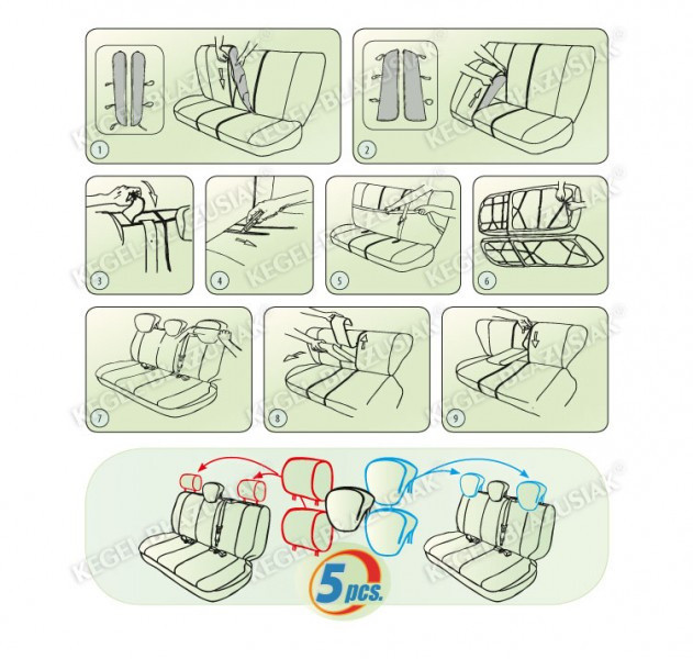 Bočnice, které jsou součástí autopotahů, se připínají na bok jednotlivých sedadel. Umožňí tak skápění i celé vyjmutí sedaček (dělení sedadel 1/3 a 2/3 - viz. fotogalerie obr.2). Díky zipům ve střední části autopotahů je možné sklápět loketní opěrku mezi zadními sedadly, pokud je jí auto vybaveno.