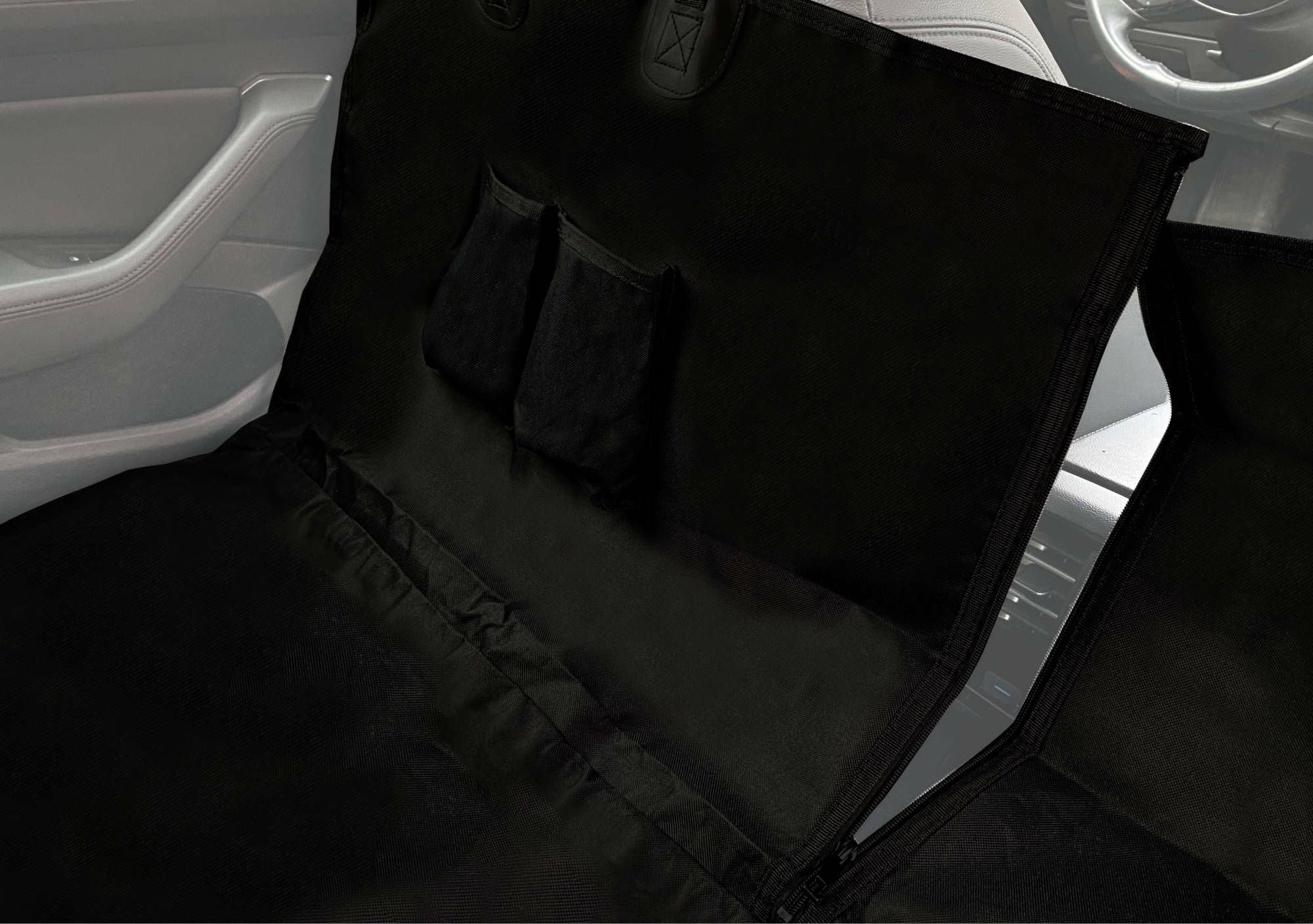 odolného materiálu, který váš mazlíček svými drápy neprotrhne a díky univerzální velikosti ochrání celý prostor zadních sedaček. Jednou z hlavních výhod tohoto ochranného povlaku je tzv. "jazyk", který při nastupování mazlíčků zabrání zašpinění nebo poškození boční strany zadních sedaček. Další předností je zip v místě mezi předními sedačkami, díky kterému budete mít nad svým mazlíčkem větší kontrolu a váš pejsek nebo kočička uvidí lépe na cestu. Povlak k zadním sedačkám