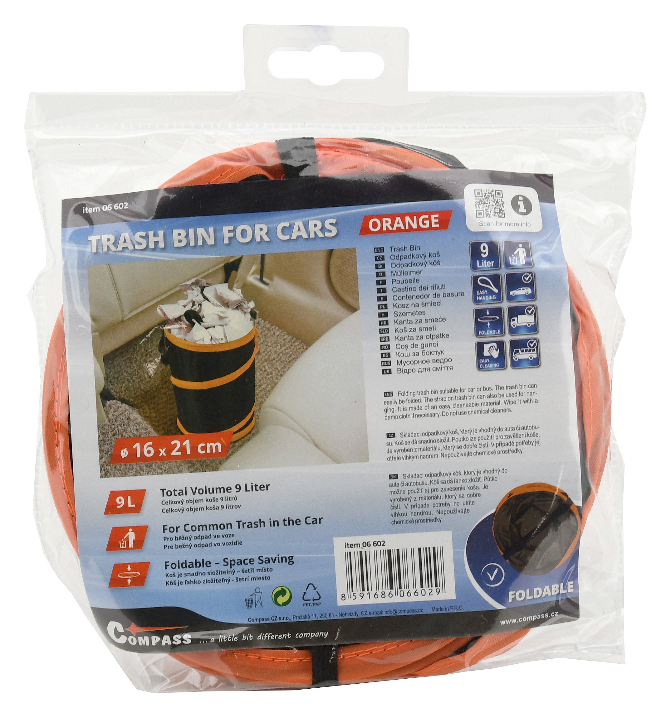 Koš s rozměry 16 x 20 cm je zhotoven ze 100% polyesteru, kvalitně obšitého oranžovým lemem. Snadno se umístí do vnitřního prostoru automobilu, kde je zabezpečen proti převrhnutí, díky suchému zipu na vnější straně dna.