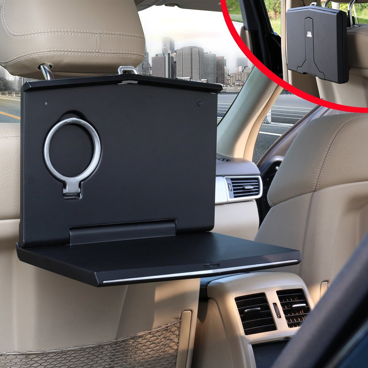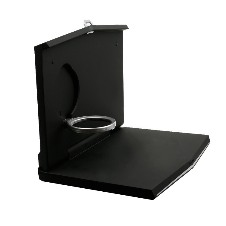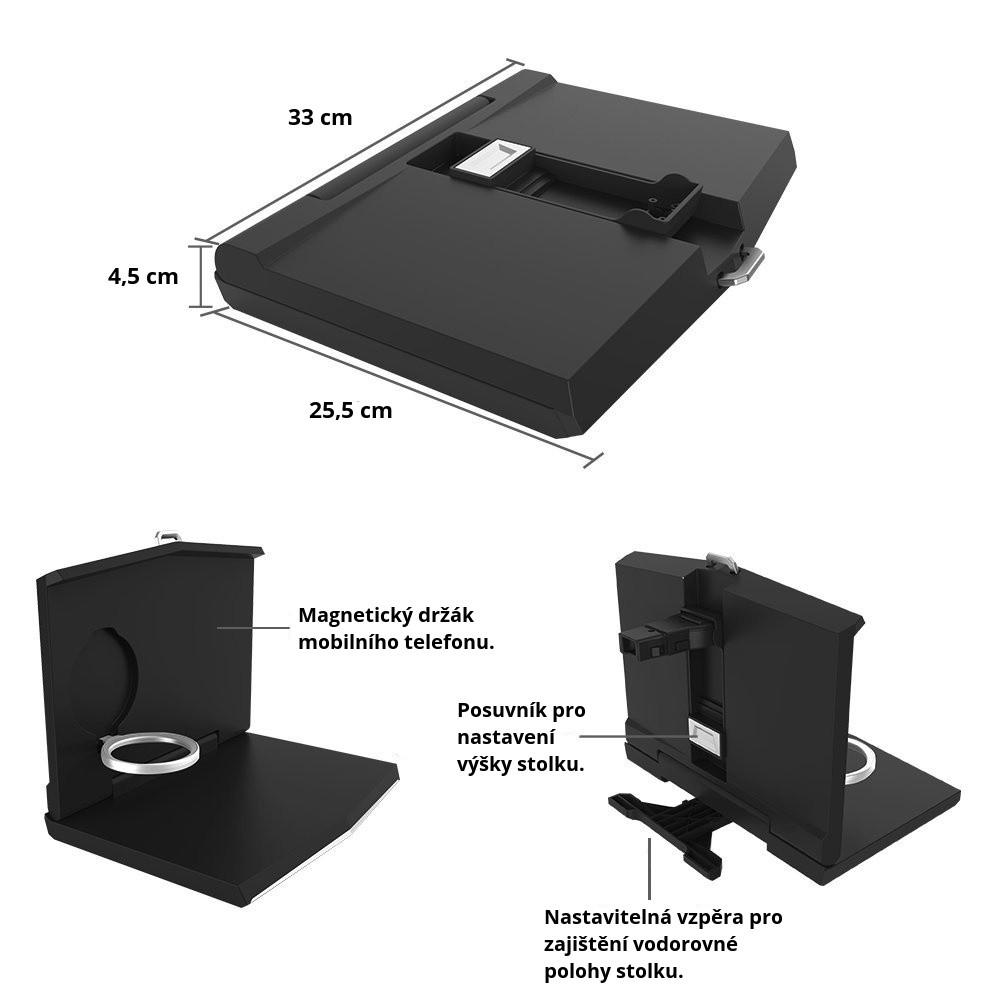 Stolek do auta má robustní pogumovanou konstrukci. Stolek je výklopný a po vyklopení je k dispozici integrovaný držák na nápoje. Zadní stěna stolku je zevnitř osazena magnetem, který slouží jako držák mobilního telefonu (plíšky s oboustrannou lepenkou pro upevnění jsou součástí balení).