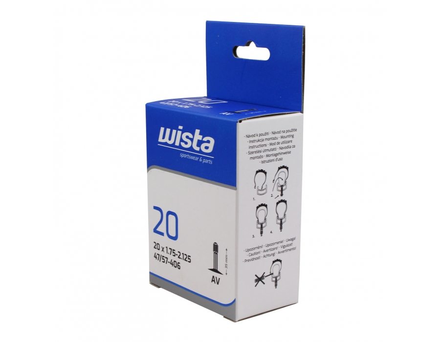 Cyklo duše WISTA jsou velmi odolné proti průrazu a udržují stálý tlak po dlouhou dobu. Použitím duší WISTA předcházíte defektům a také snižujte riziko úbytku tlaku. Nižší hmotnost navíc zlepšuje jízdní vlastnosti. Materiál: vyrobeny z vysoce kvalitního butylového kaučuku Technický popis: udržují stálý tlak po dlouhou dobu velmi odolné proti průrazu rozměr 20x1,75-2,125 rozměr 47/57-406 auto ventilek AV 35 mm