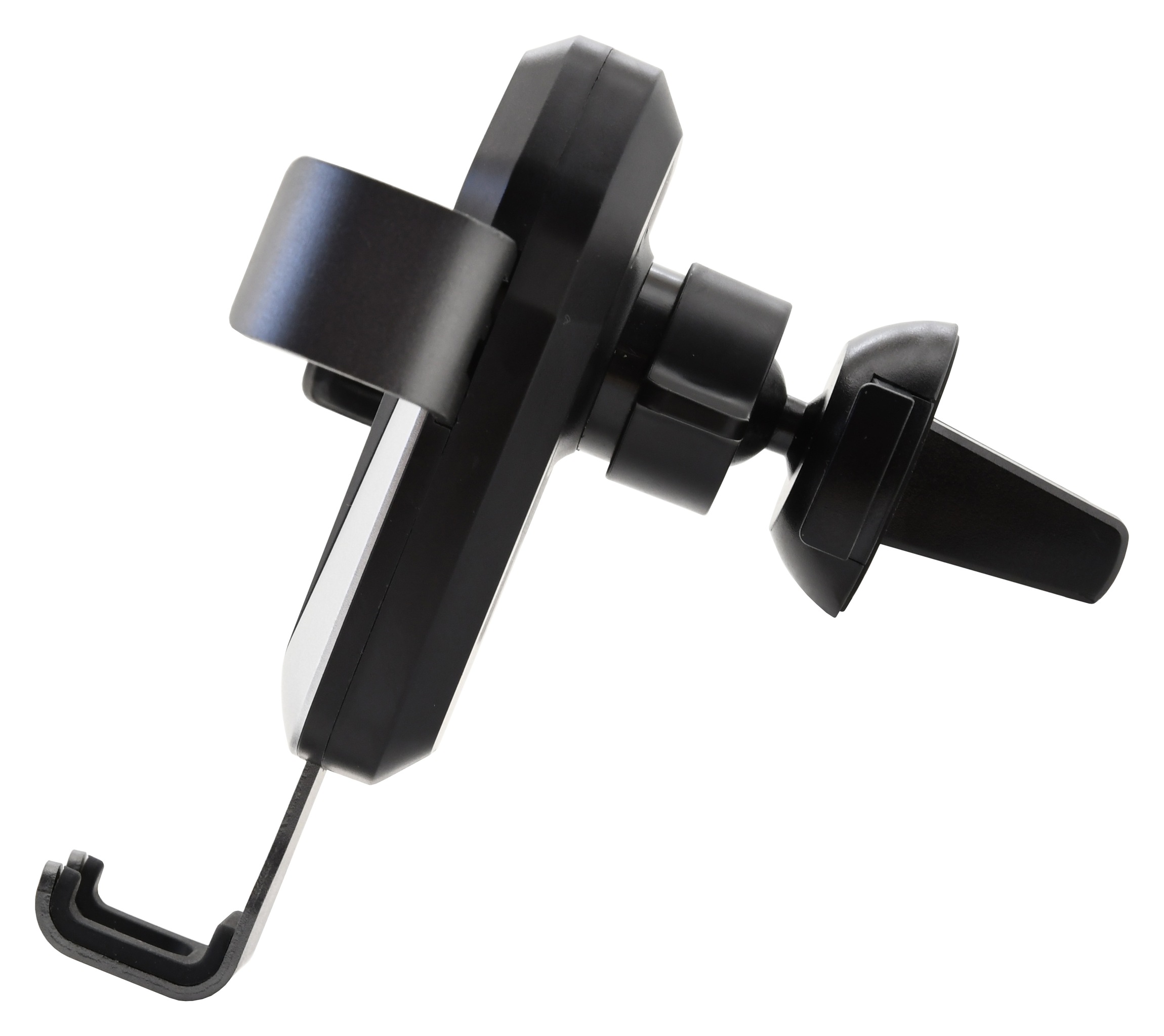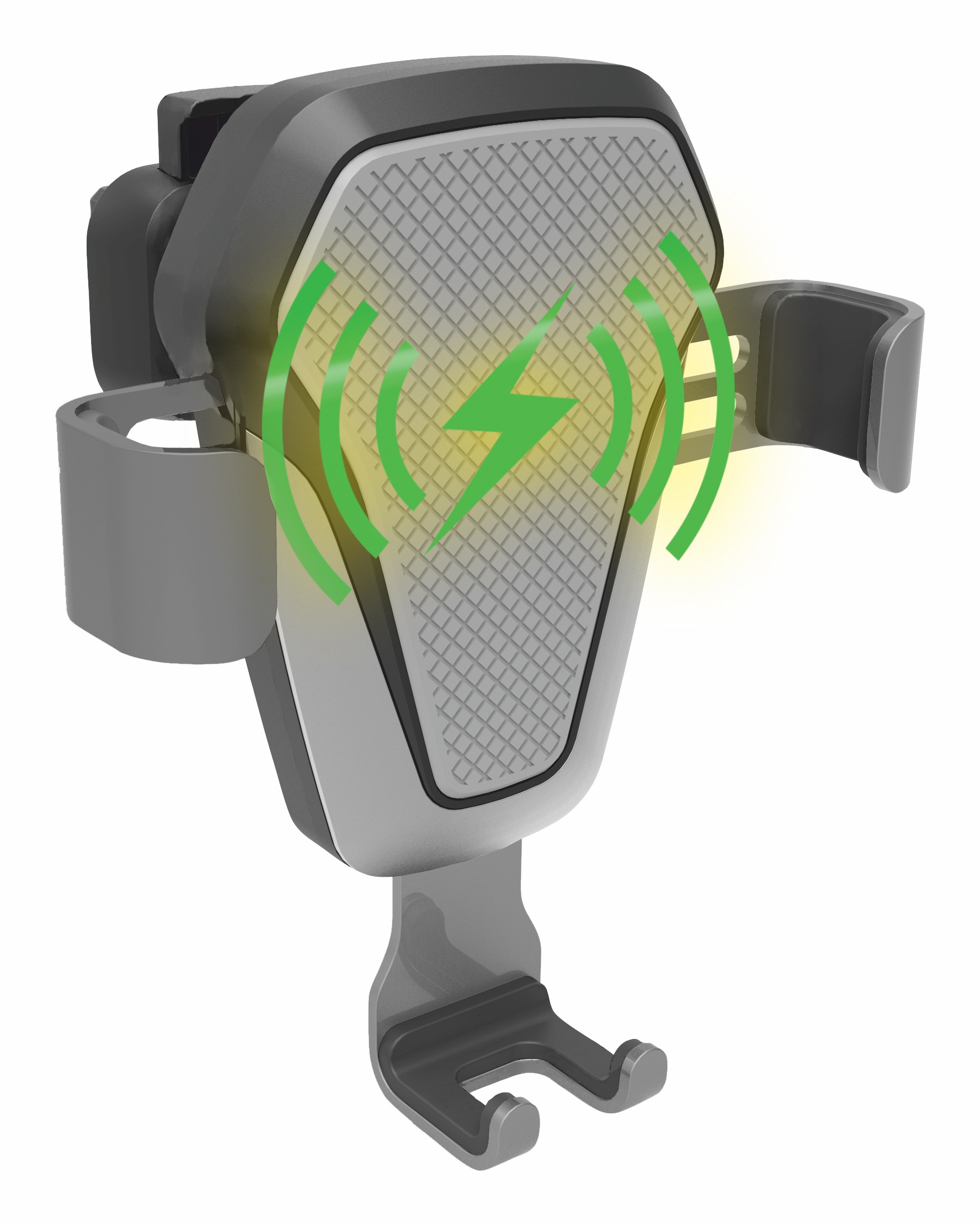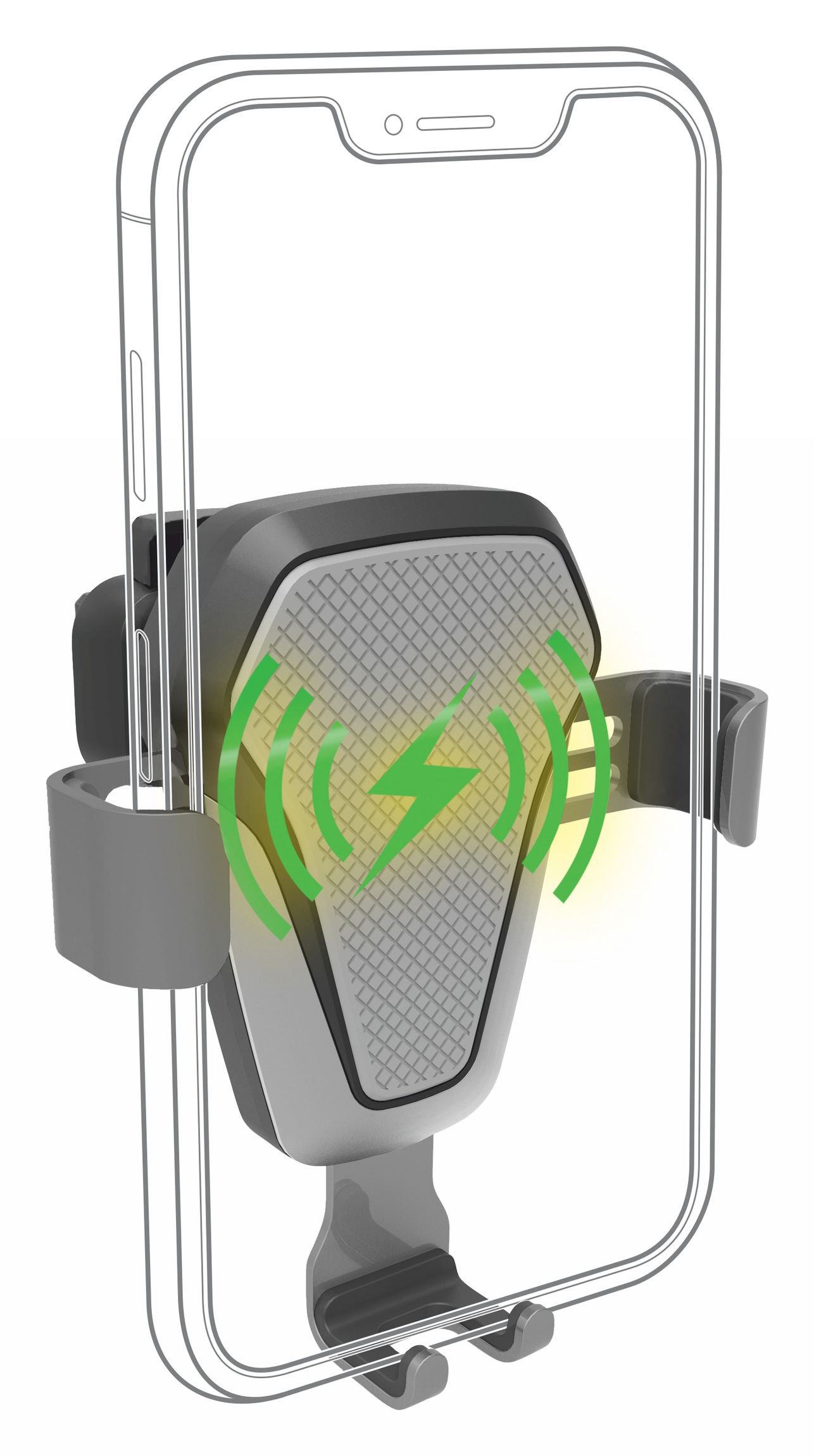Univerzální držák telefonu řady LUKE pro upevnění do mřížky ventilace s možností automatického bezdrátového dobíjení telefonu standardu Qi a umístěním telefonu jednou rukou.