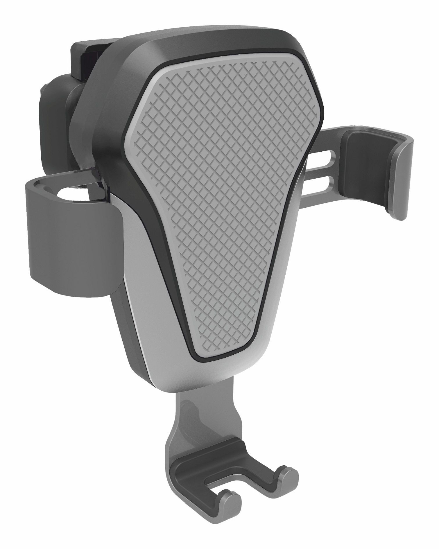 Držák je opatřen gravitačním systémem uchycení telefonu, kdy telefon svojí vahou působí na spodní rameno držáku, díky čemuž se stáhnou boční ramena, která telefon upevní.