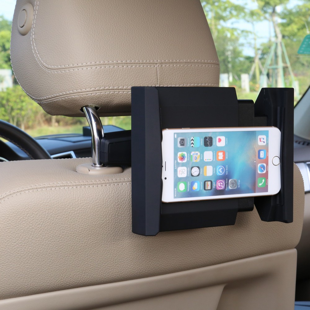 Mezi konzolky hlavových opěrek se rozepře adaptér, který je možné na sedačce nechat permanentně. Samotný držák tabletu se poté pomocí rychloupínacího mechanismu jednoduše připevní k adaptéru.
