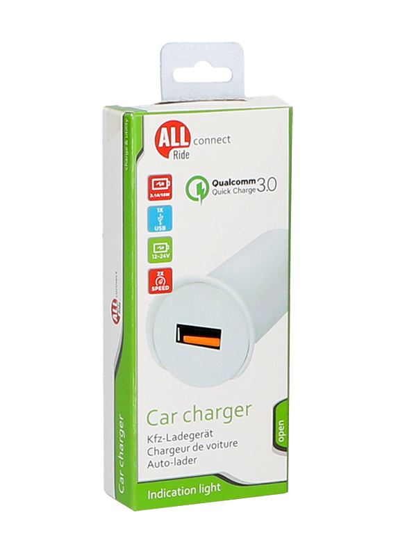 Hříbek bez kabelu do 12/24V zásuvky vozidla. 1 USB zdířka: rychlonabíjení Qualcomm 3.0 (dvojnásobná rychlost nabíjení). Nabíjecí proud 3,1 A, výkon 18 W.