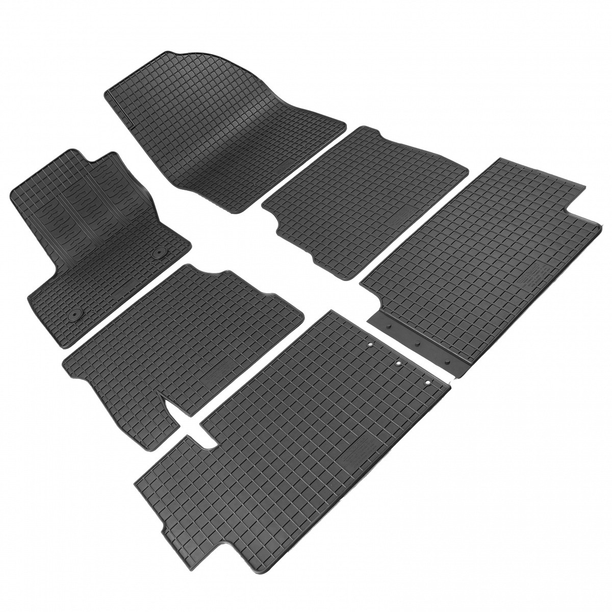 Gumové autokoberce pro vůz Ford Tourneo Connect v sedmimístné variantě, který se vyrábí od roku 2013. Jedná se o sadu na celý vůz. Autokoberce mají tradiční (čtverčkovaný) design, díky kterému nedochází k přelévání vody, popř. tajícího sněhu po kobercích. Okraj autokoberců je přibližně 1 cm vysoký.