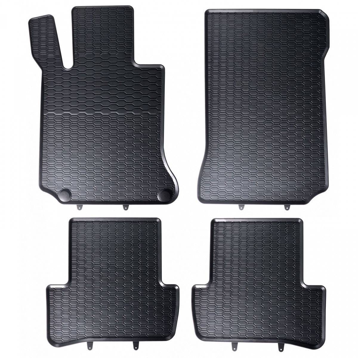 Robustní gumové autokoberce pro vůz Mercedes C-Class. Mají dezén ve tvaru pláství, díky kterému nedochází k přelévání vody nebo tajícího sněhu po kobercích. Okraj autokoberců je přibližně 1 cm vysoký.