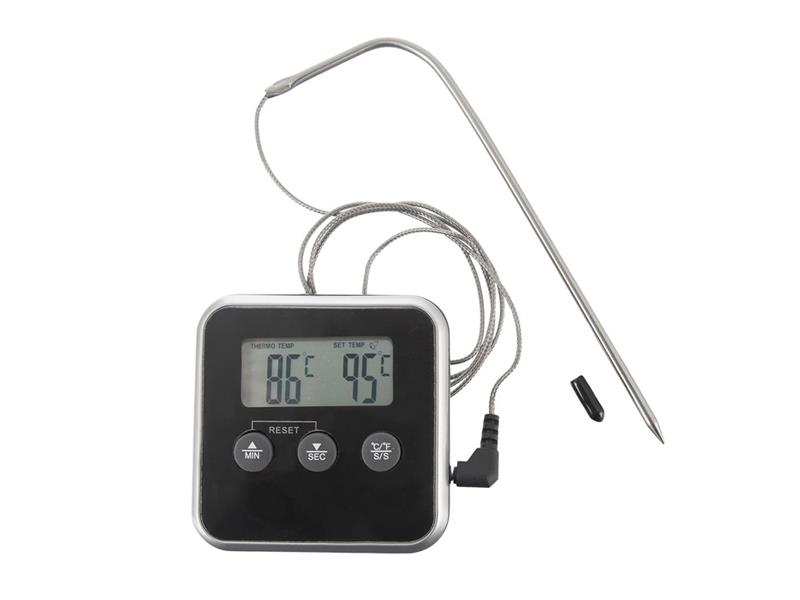 Kuchyňský digitální teploměr se sondou a kuchyňská minutka v jednom je skvělý pomocník nejen při přípravě masa. Využít jej můžete při grilování na grilu, pečení masa v troubě, při uzení v udírně, při chlazení potravin v lednici, při vaření džemů, sirupů, karamelu... Teploměr umožňuje nastavit teplotní alarm při dosažení požadované teploty. Jakmile teplota pokrmu dosáhne zvolené teploty, ozve se zvukový signál. Nebo můžete zvolit režim minutky, které klasicky odpočítá nastavený čas a o jeho konci vás informuje zvukový signál. Možnost nastavení jednotky teploty: °C/°F. Rozsah měření teploty: od -20 °C do +300 °C, rozsah časovače 99 min 59 sec. Možnost zavěšení, postavení pomocí stojánku nebo přichycení magnetem na zadní straně teploměru. Přepínač časovače a měření teploty na zadní straně teploměru (COOK/TIMER).