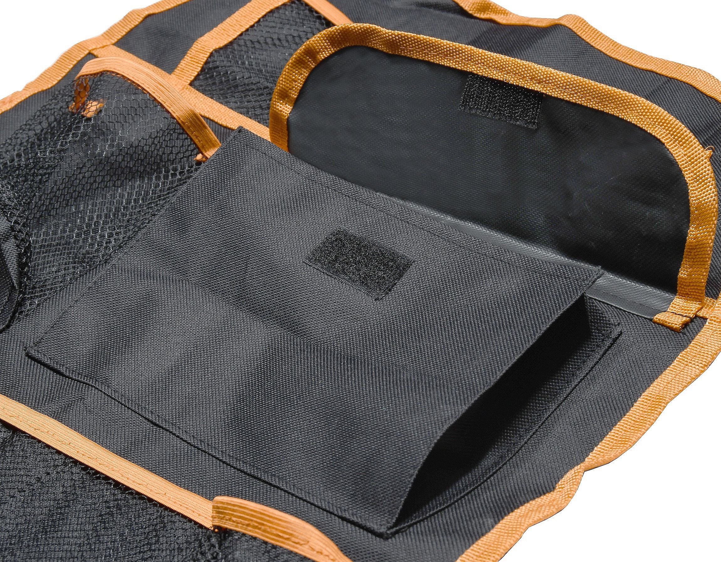 Disponuje kapsami, sítěnými přihrádkami, držáky na lahve a uzavíratelnou kapsou na suchý zip. Organizér je zhotoven ze 100% polyesteru, kvalitně obšitého oranžovým lemem. Kapsy jsou opatřeny gumou oranžové barvy.