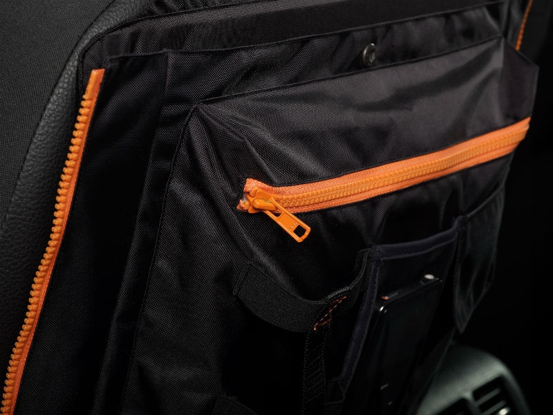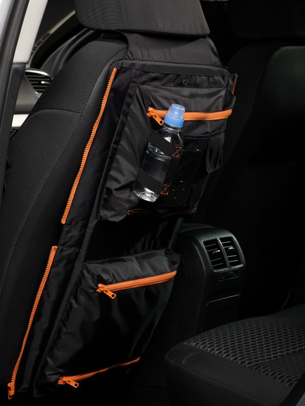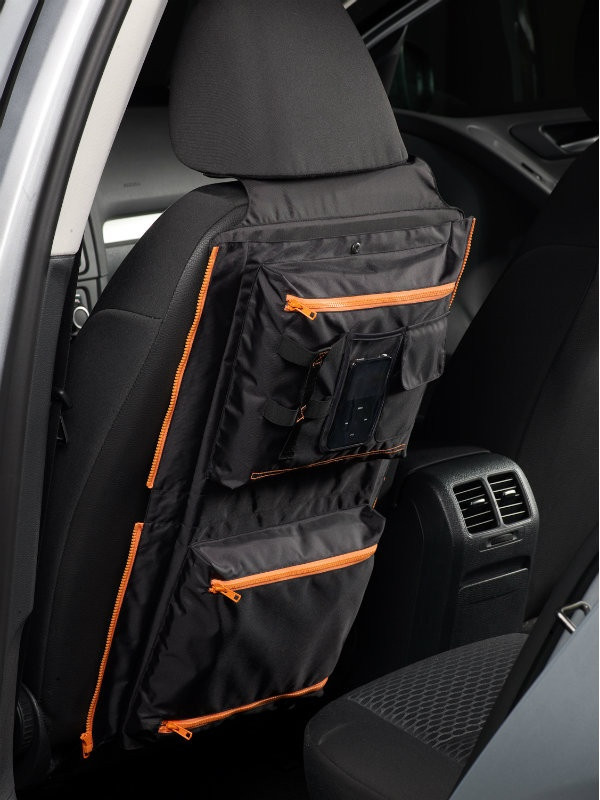 Organizér se upevňuje na sedačku pomocí popruhů, ze kterých lze jednoduše sejmout a díky důmslným zipům jej přetvořit na stylovou tašku.