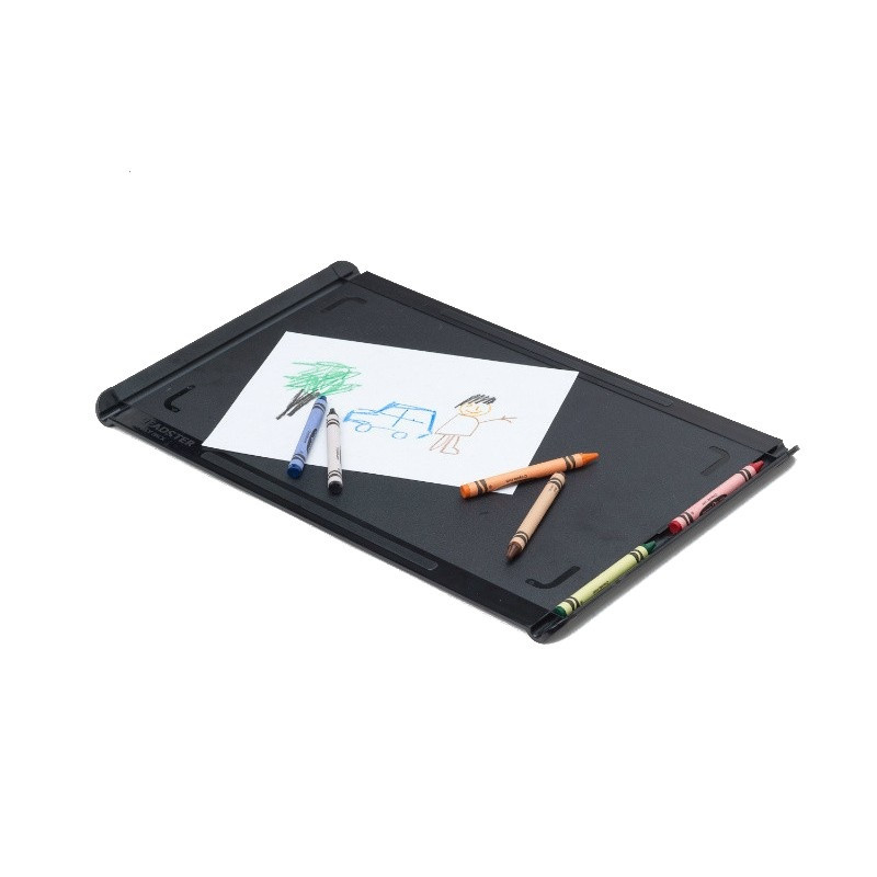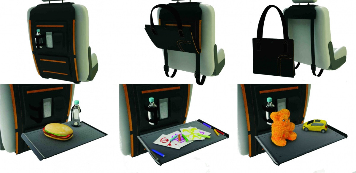Součástí organizéru je i dětská kreslící podložka, kterou lze použít i jako menší odkladní stolek. V době, kdy se nepoužívá, se kreslící deska jednoduše upevní mezi popruhy na zadní stranu organizéru.