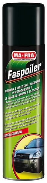 Jestliže vás pohled na vaše auto rozesmutní, potom si u tohoto výrobku zamilujete každý detail. FASPOILER je výrobek pro všechny, co se nespokojí s málem a stále hledají něco lepšího, perfektního. Jedná se o sprej, který jedním rázem obnoví - aniž by umastil - nárazníky, boční lišty, spoilery a kapoty. Je bohatý na vzácné a výživné látky na bázi polymerů a vytváří lesklou, trasparentní a ochrannou vrstvu. Tato vrstva od FASPOILER pevně přilne k ošetřované ploše, prakticky okamžitě obnoví plastové povrchy vyztužené skelnými vlákny (boční lišty a nejen ty), plasty - vybledlé či poškozené dlouhým vystavením slunečním paprskům - či jakoukoliv gumovou součást. Pokud používáte FASPOILER pravidelně, potom předejdete vyblednutí a zestárnutí odkrytých a nechráněných částí. Vrstva vytvořená na povrchu ošetřované části vydrží nějakou dobu působení vlivu studené a teplé vody, slunce a prachu, aniž by na sobě nechala znát nepříjemné popraskání a zároveň zůstane neviditelná. MA-FRA FASPOILER je používán profesionály v mycích centrech a prodává se v balení o obsahu 300 ml.