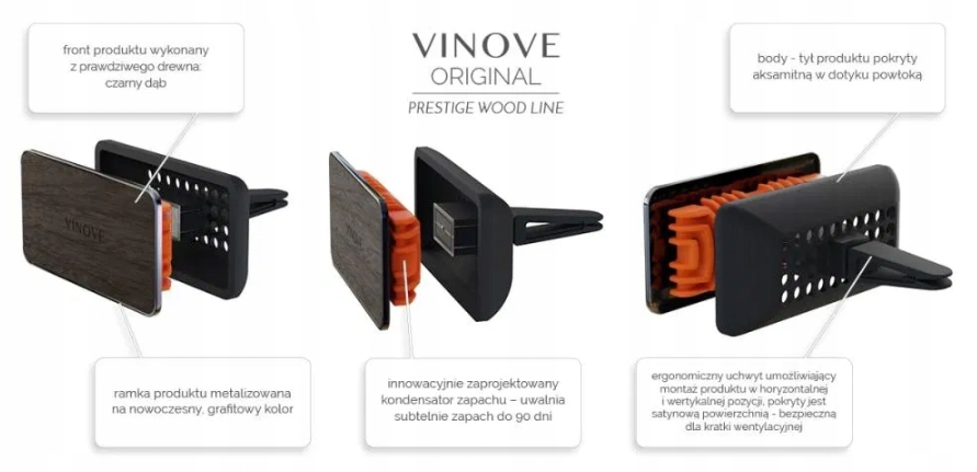 Popis produktu VINOVE - EXKLUZIVNí AUTOPARFUMY Nová značka autoparfémů, kterou vytvořili polští nadšenci ve spolupráci s francouzskými mistry parfumérského umění a italskými designéry a vědci. K jejich vytvoření byla použita technologie 21. století. S využitím znalostí, otevřenosti a zkušeností týmu vědců a spolu s nimi se podařilo kondenzovat vůně do inovativního polymeru. Byl tvarován tak, že vzduch z průduchů v autě jemně proudí kolem polymerového labyrintu a uvolňuje vůni jemně a dlouhodobě – až 90 dní. Při navrhování nosiče vůní se dbalo na jeho využitelnost: dlouhotrvající uvolňování vůně, bezpečnost pro čalounění a kokpit auta, jakož i exkluzivní vzhled, ladící se stylem moderních aut. VINOVE MIAMI ORIGINAL - parfém do ventilační mřížky STARTER - MIAMI Trvanlivost - 90 dní Energizující vůně Miami spojuje svěžest citrusů s vůní sluncem políbené pokožky, nadšení nefalšovaného mládí s vanilkovo-pižmovou elegancí. Svádí svěžestí sicilských citrónů a bergamotů, které harmonicky znějí v doprovodu ovocných třpytek a jiskry elemi pryskyřice. Dokonalá vůně, která je kombinací citlivé, subtilní ženskosti podpořené tvrdým mužským ramenem. Horní vrstva (hlava): citron, mandarinka, červená paprika Prostřední vrstva (srdce): jasmín, konvalinka, lilie, elem Spodní vrstva (základ): santalové dřevo, cedr, vetiver, ambra, pižmo Rozměry: 7,4 x 3,7 cm (hloubka 2,2 cm bez háčku nebo 5,3 cm s háčkem) Balení: Hmotnost: 0,06 kg Rozměry: 11,1 × 6,7 × 4,2 cm