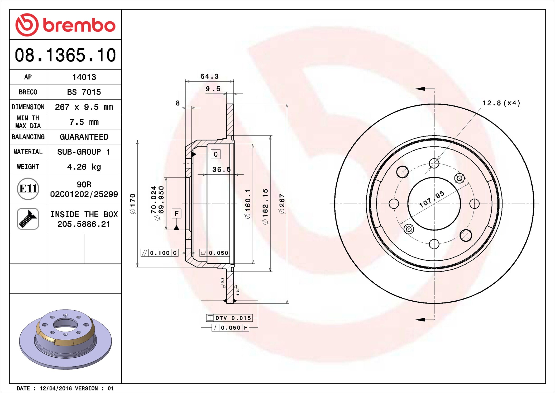 BREMBO 08.1365.10 - Brzdový kotouč