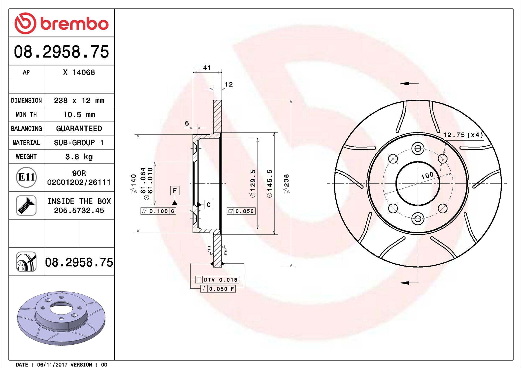 BREMBO 08.2958.75 - Brzdový kotouč