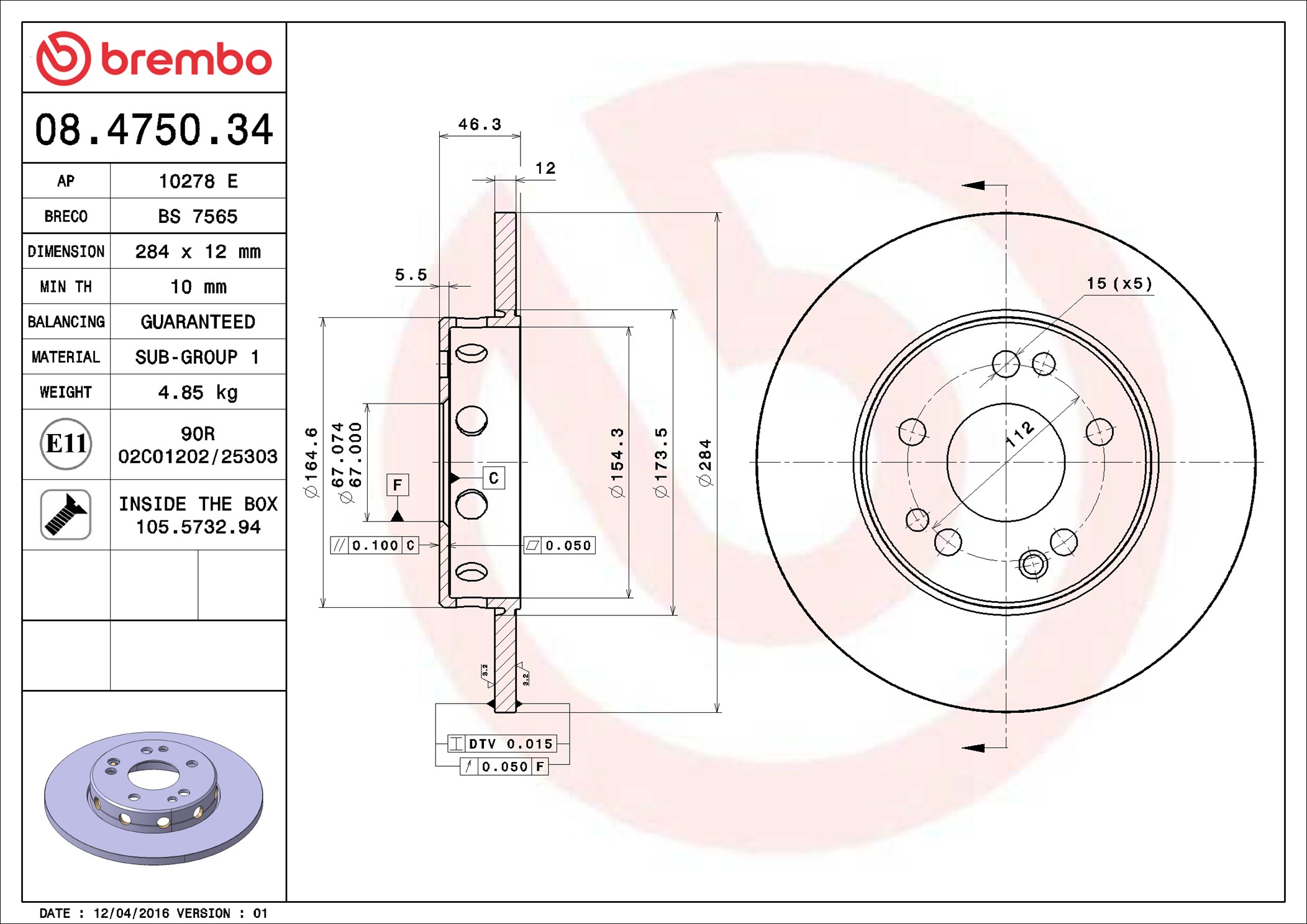 BREMBO 08.4750.34 - Brzdový kotouč