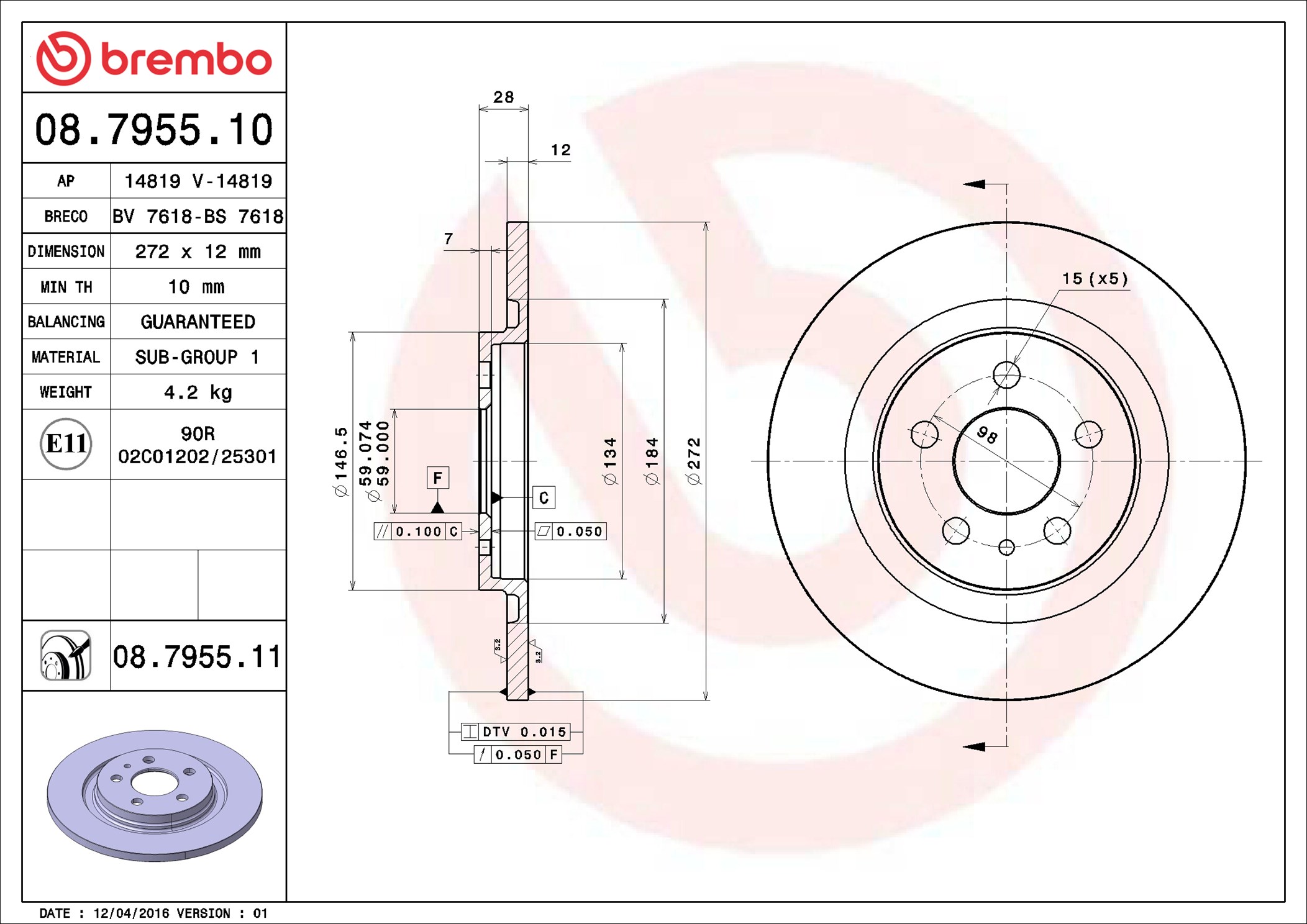 BREMBO 08.7955.11 - Brzdový kotouč