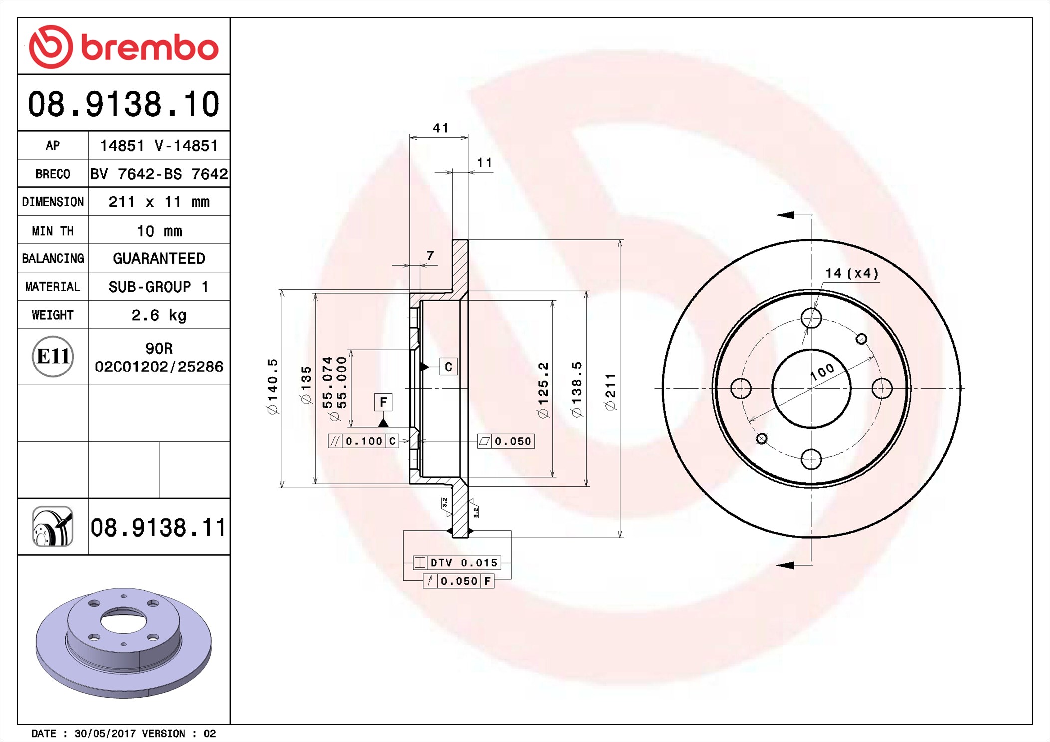 BREMBO 08.9138.10 - Brzdový kotouč