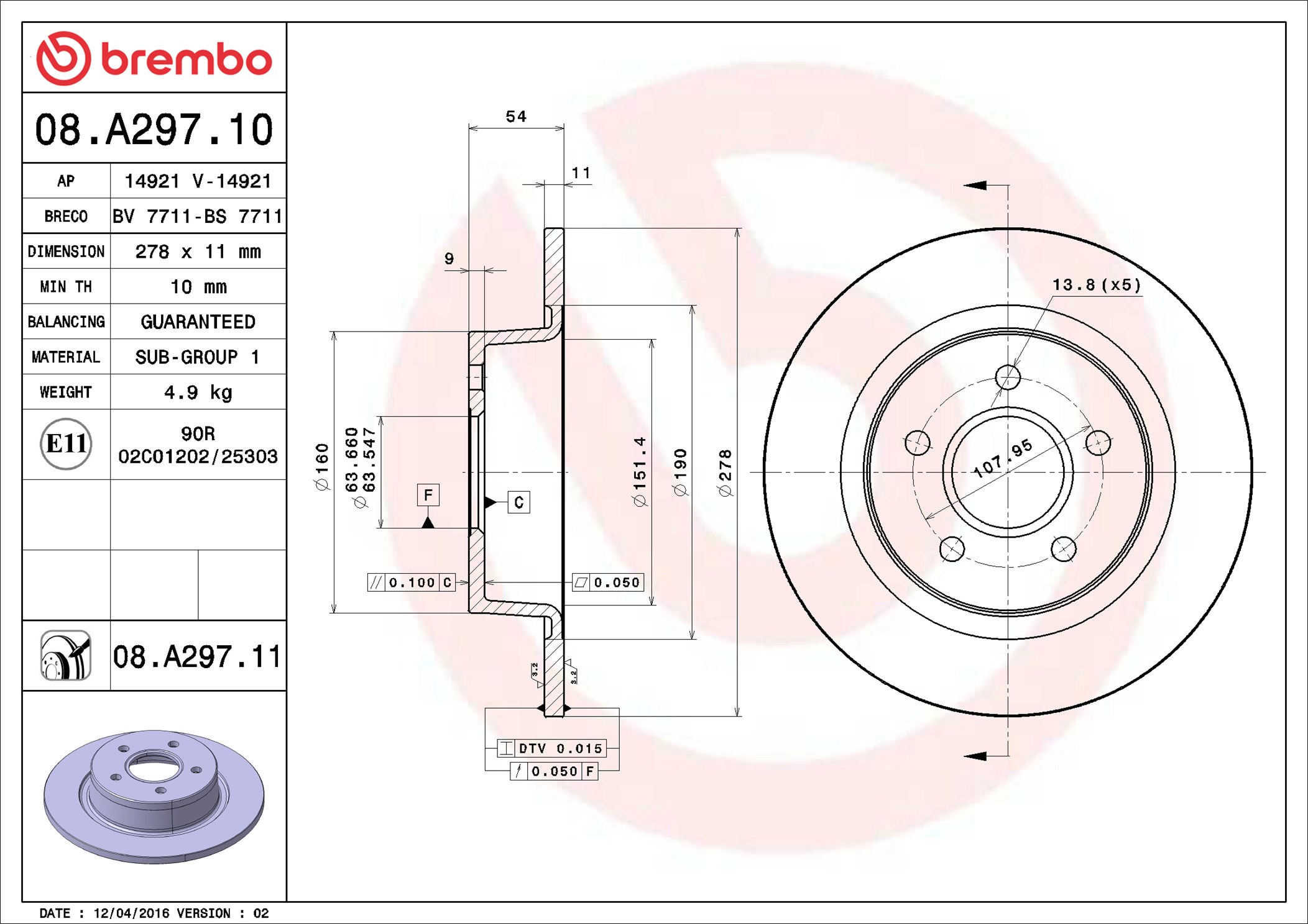 BREMBO 08.A297.11 - Brzdový kotouč