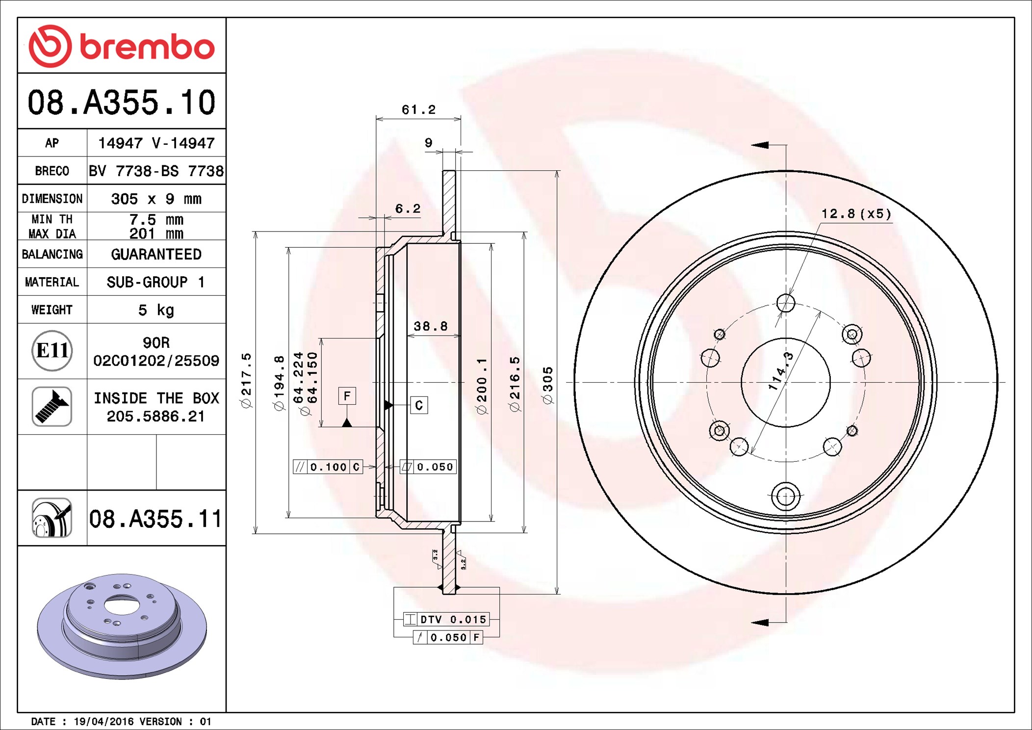 BREMBO 08.A355.11 - Brzdový kotouč