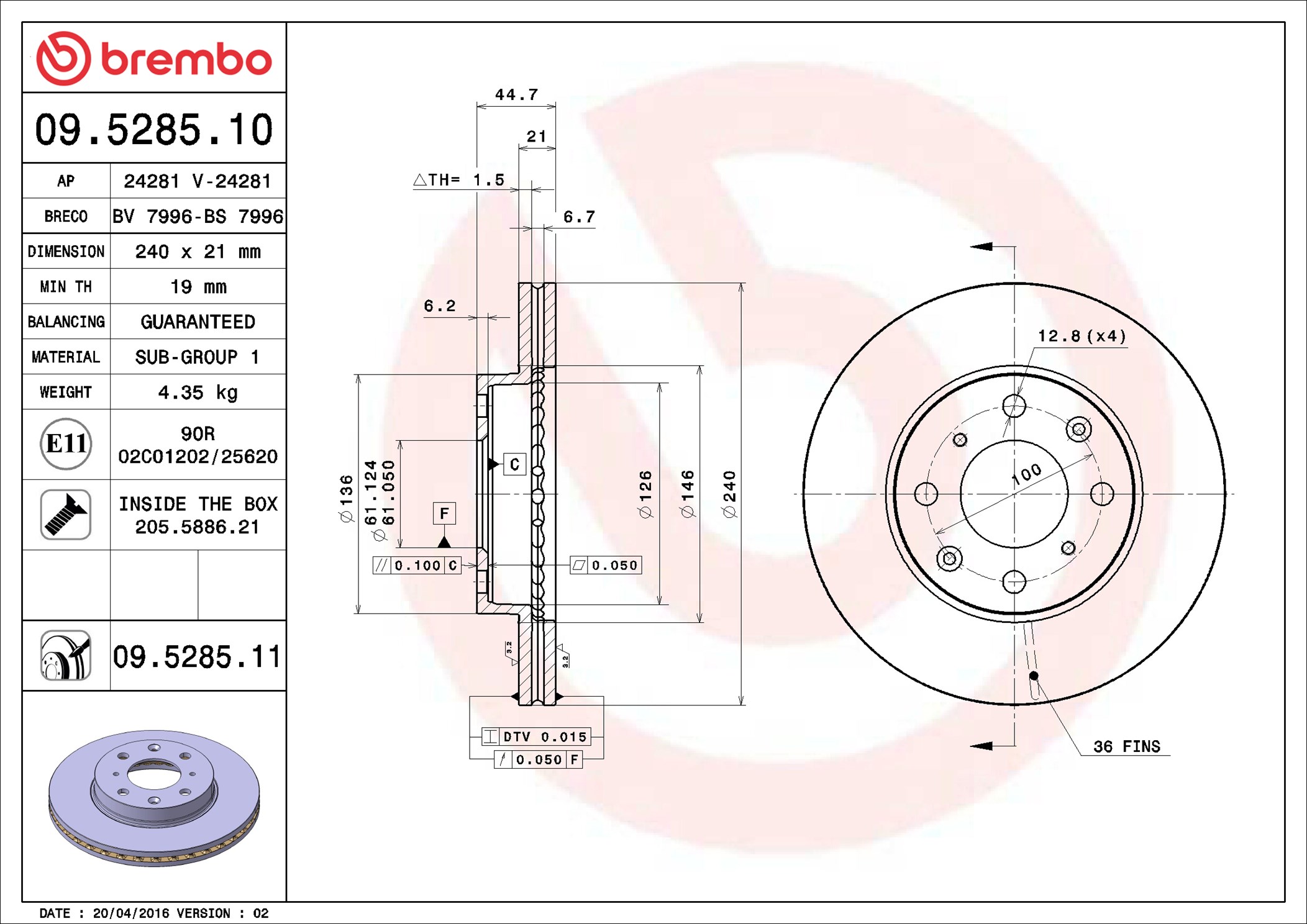 BREMBO 09.5285.11 - Brzdový kotouč