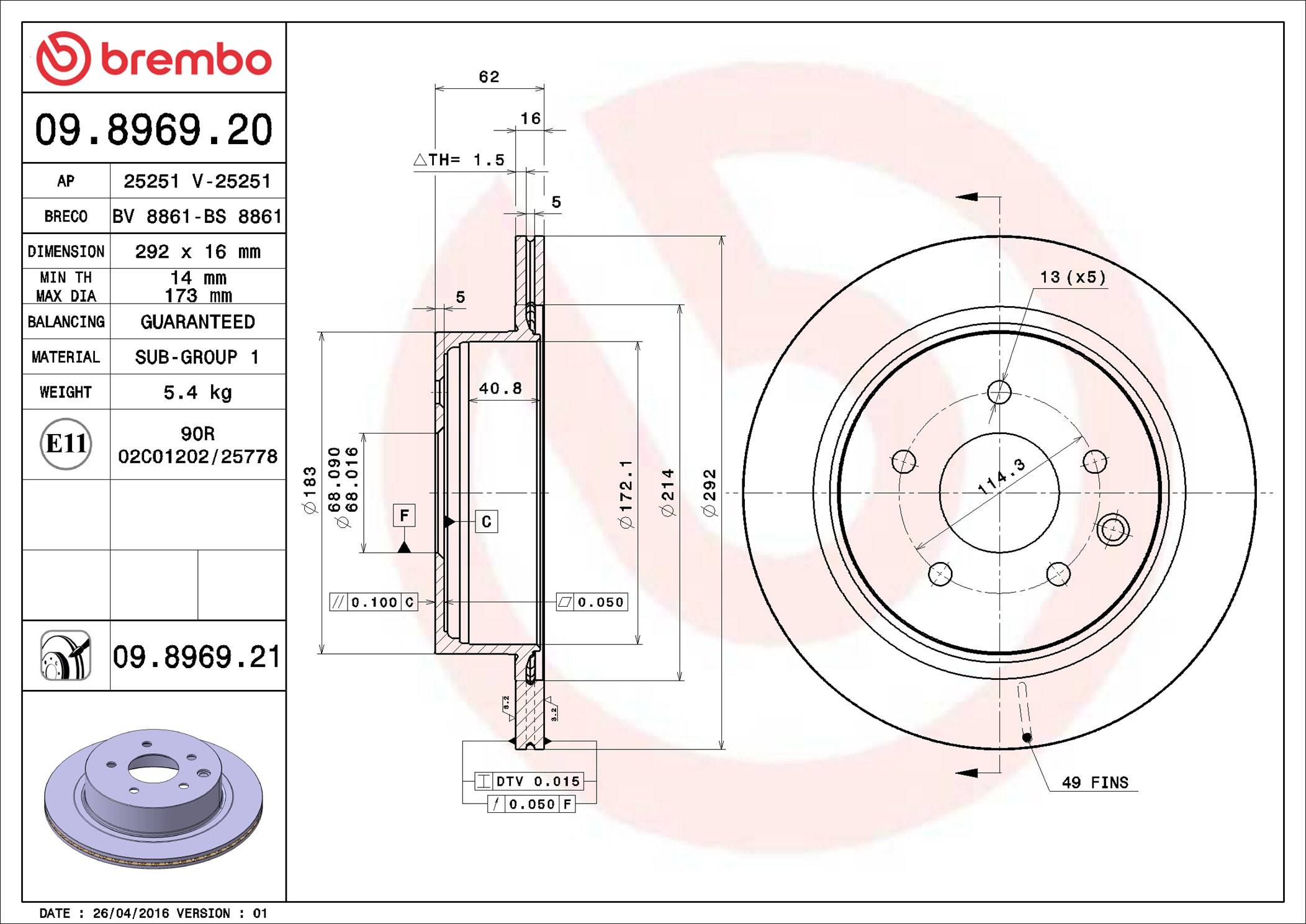 BREMBO 09.8969.20 - Brzdový kotouč