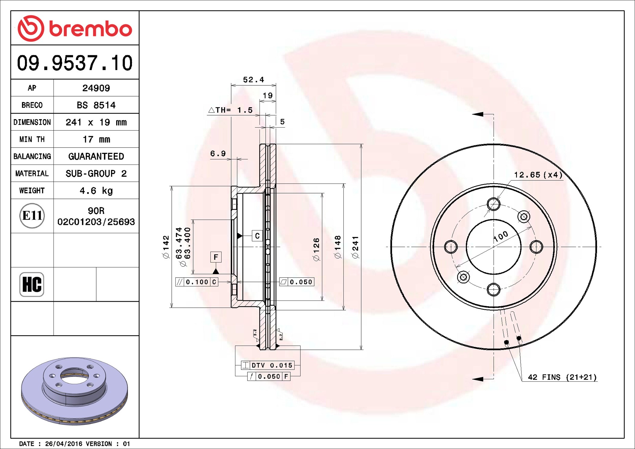 BREMBO 09.9537.10 - Brzdový kotouč