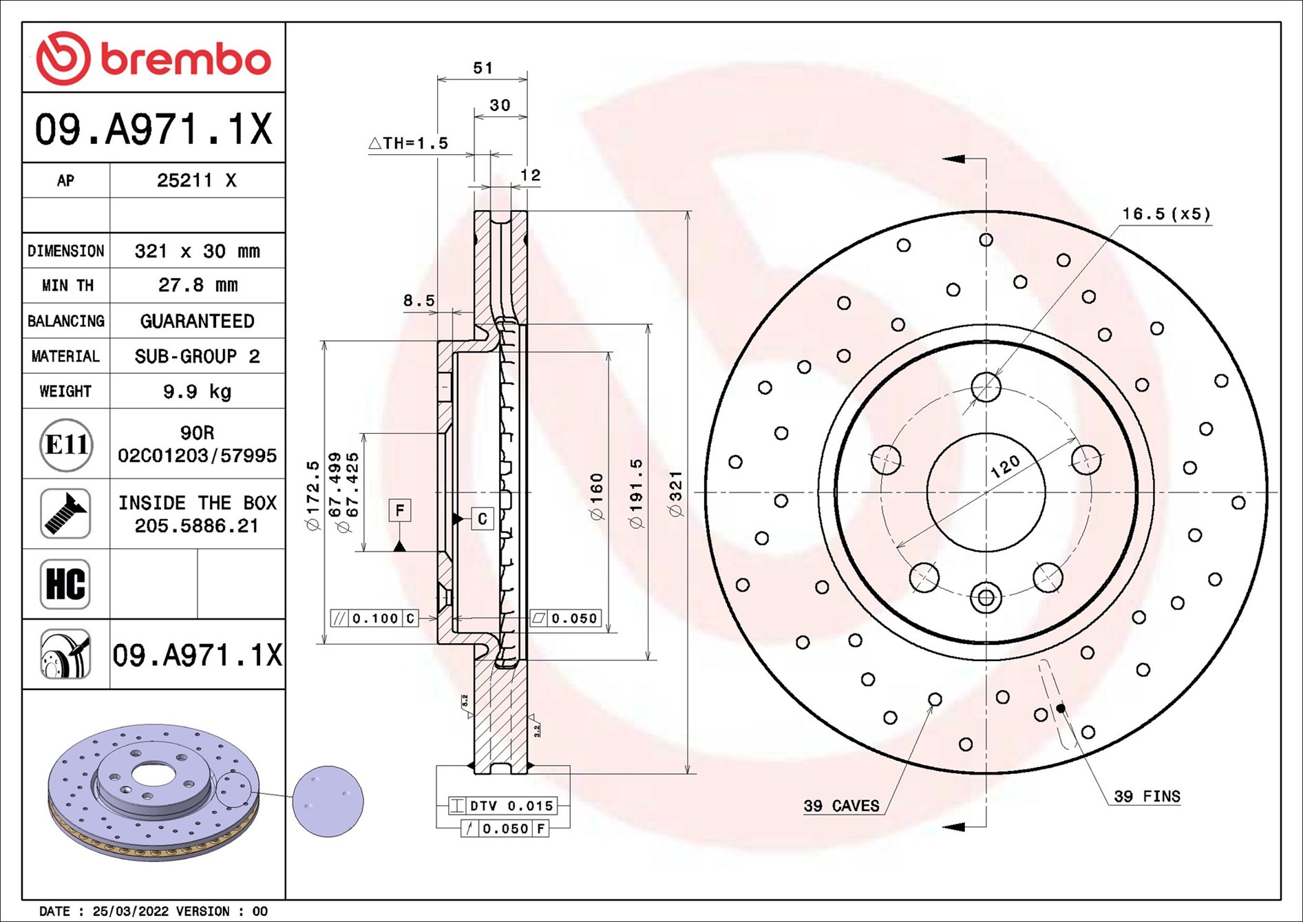 BREMBO 09.A971.1X - Brzdový kotouč