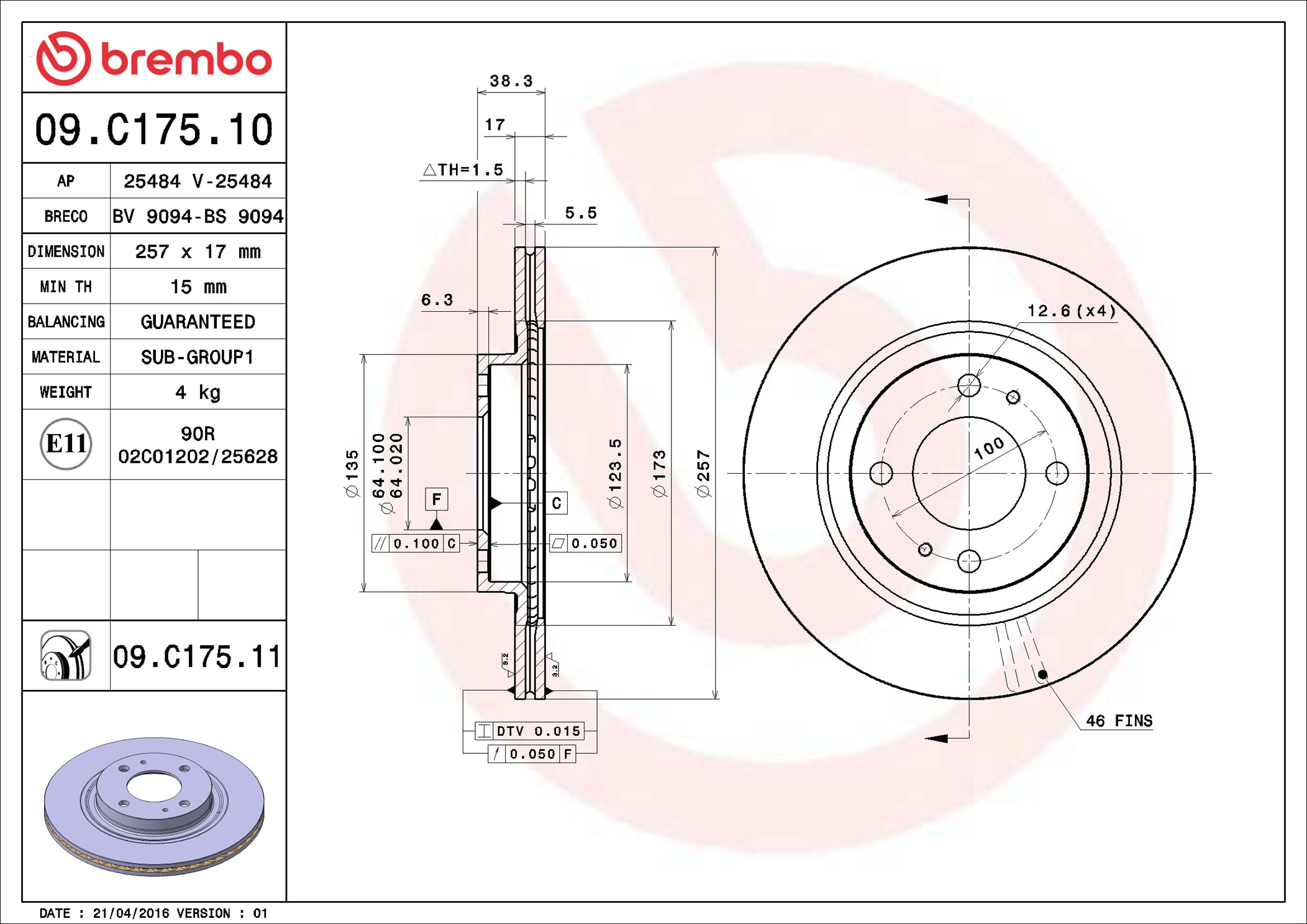 BREMBO 09.C175.11 - Brzdový kotouč