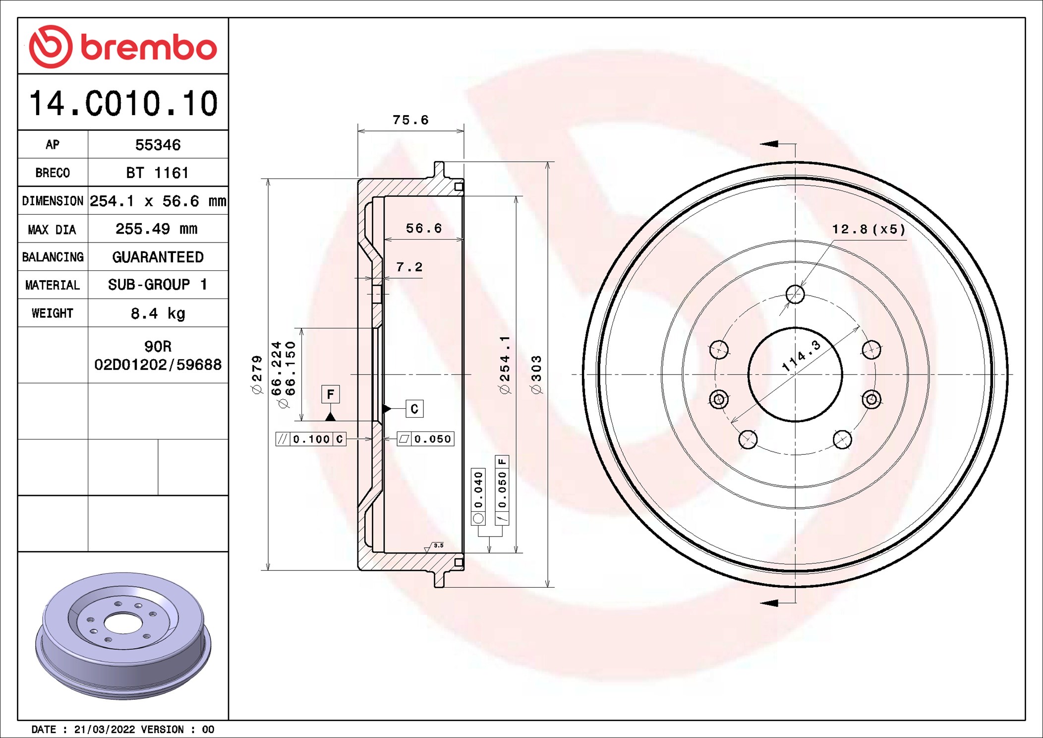 BREMBO 14.C010.10 - Brzdový buben