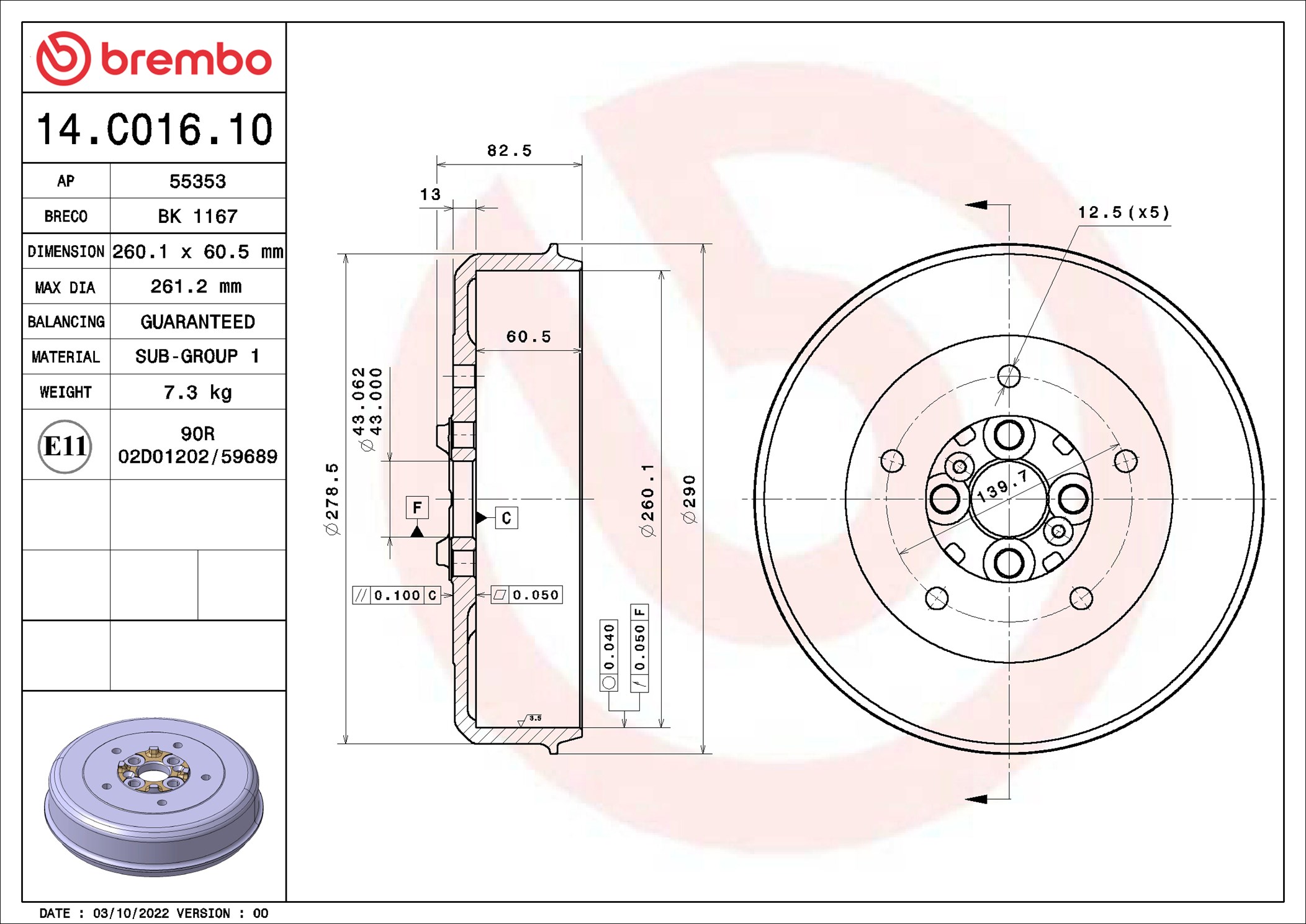 BREMBO 14.C016.10 - Brzdový buben