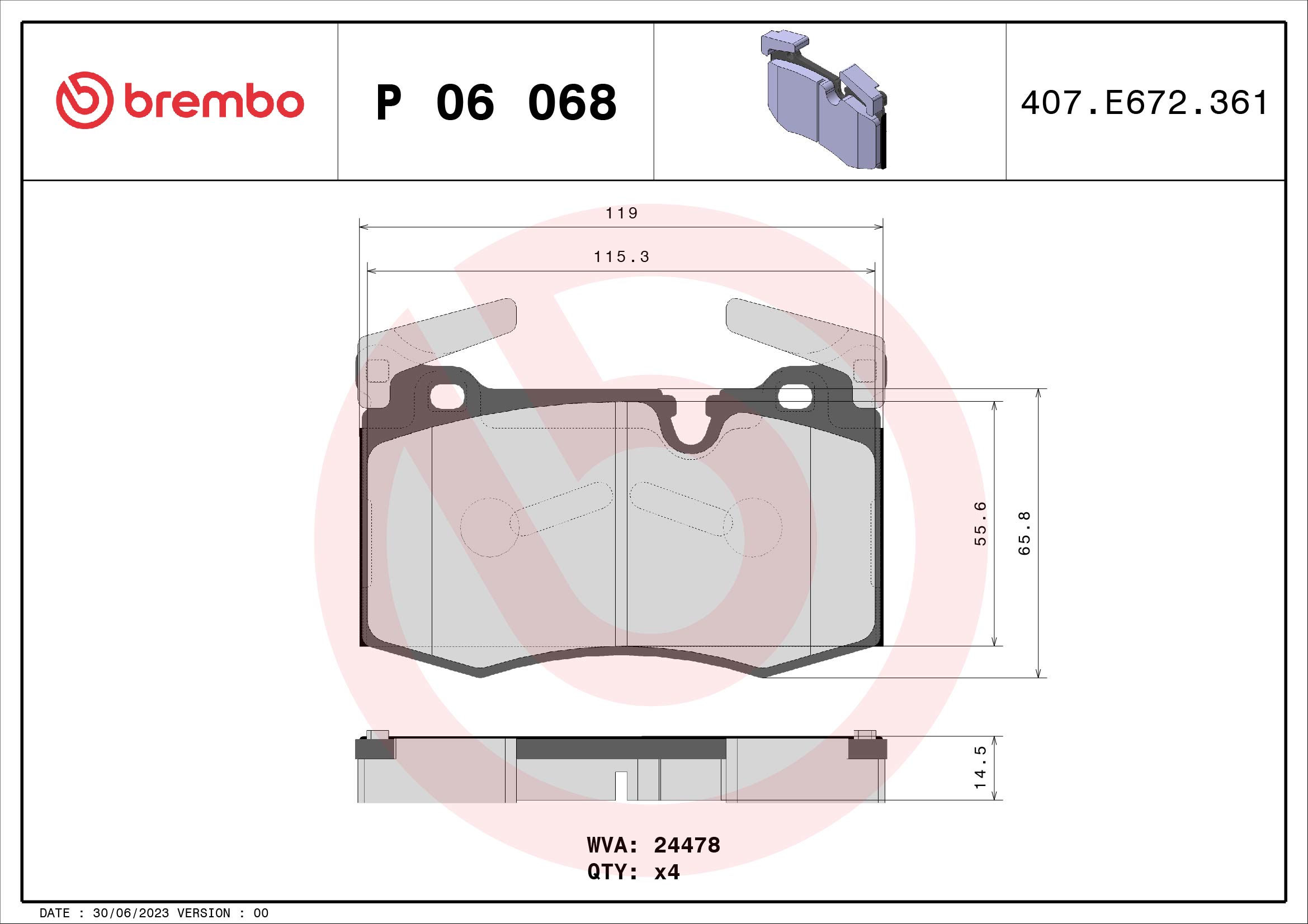 BREMBO P 06 068 - Sada brzdových destiček, vždy 4 kusy v sadě