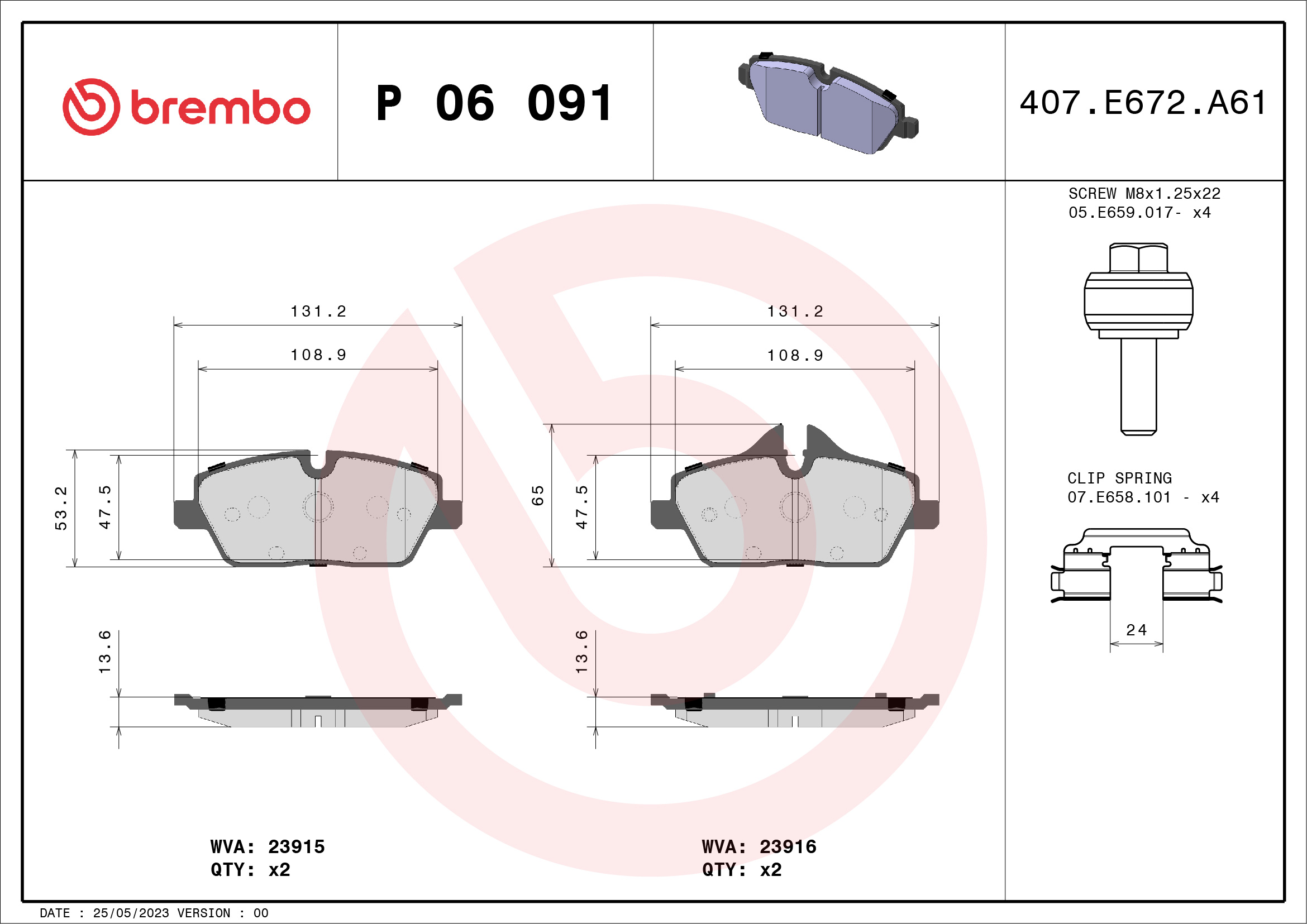 BREMBO P 06 091 - Sada brzdových destiček, vždy 4 kusy v sadě