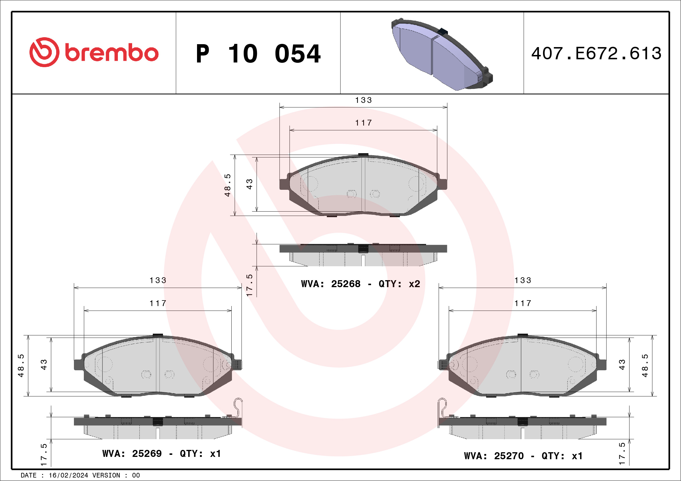 BREMBO P 10 054 - Sada brzdových destiček, vždy 4 kusy v sadě