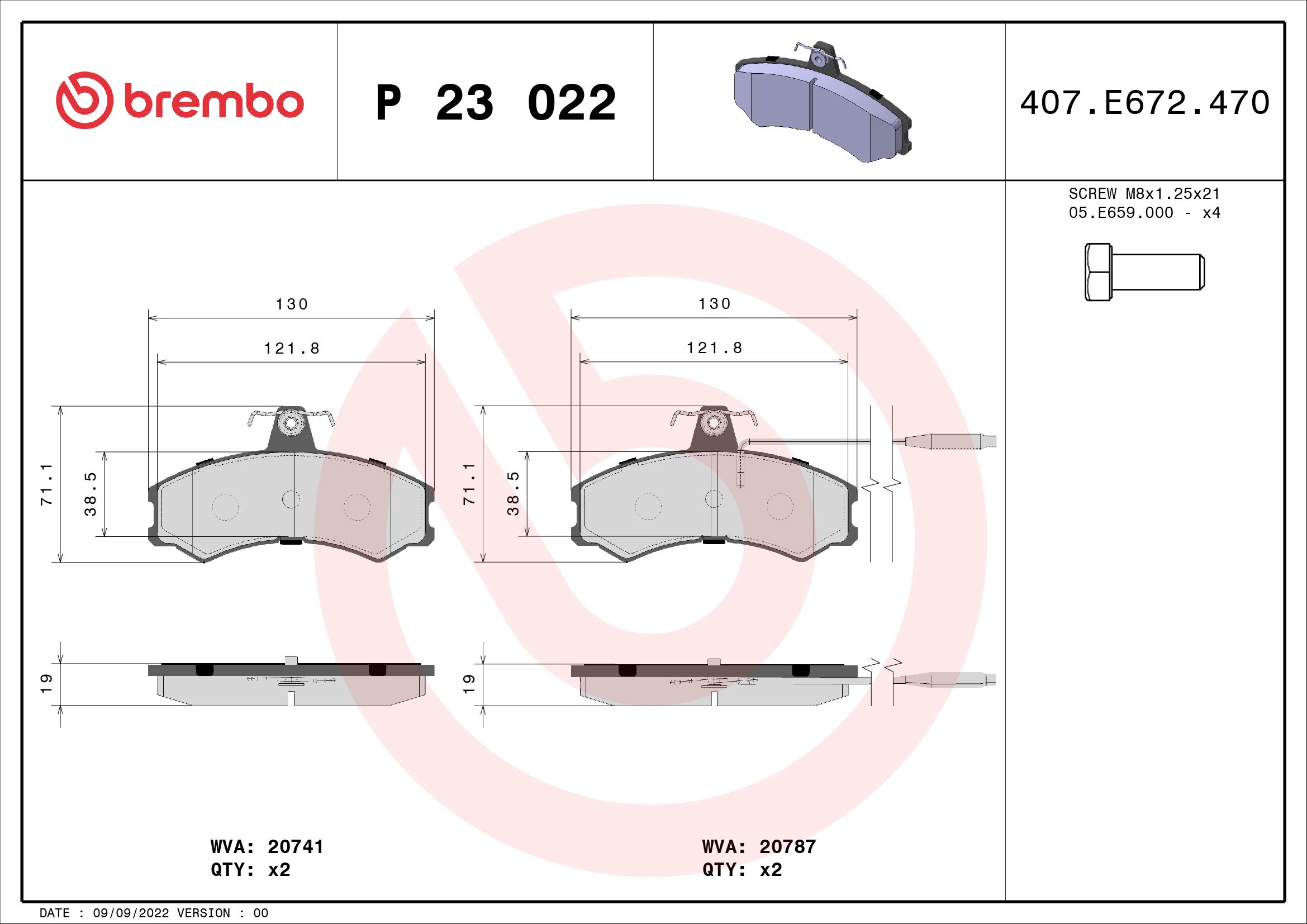 BREMBO P 23 022 - Sada brzdových destiček, vždy 4 kusy v sadě
