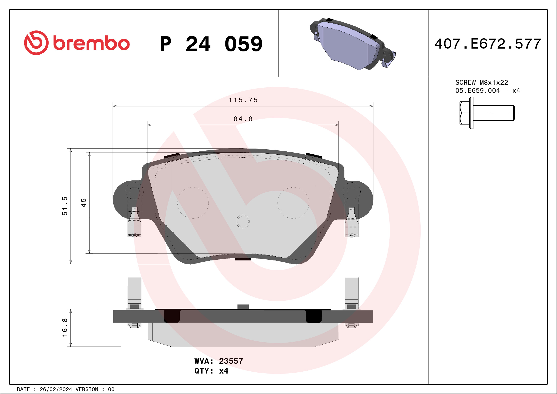 BREMBO P 24 059 - Sada brzdových destiček, vždy 4 kusy v sadě