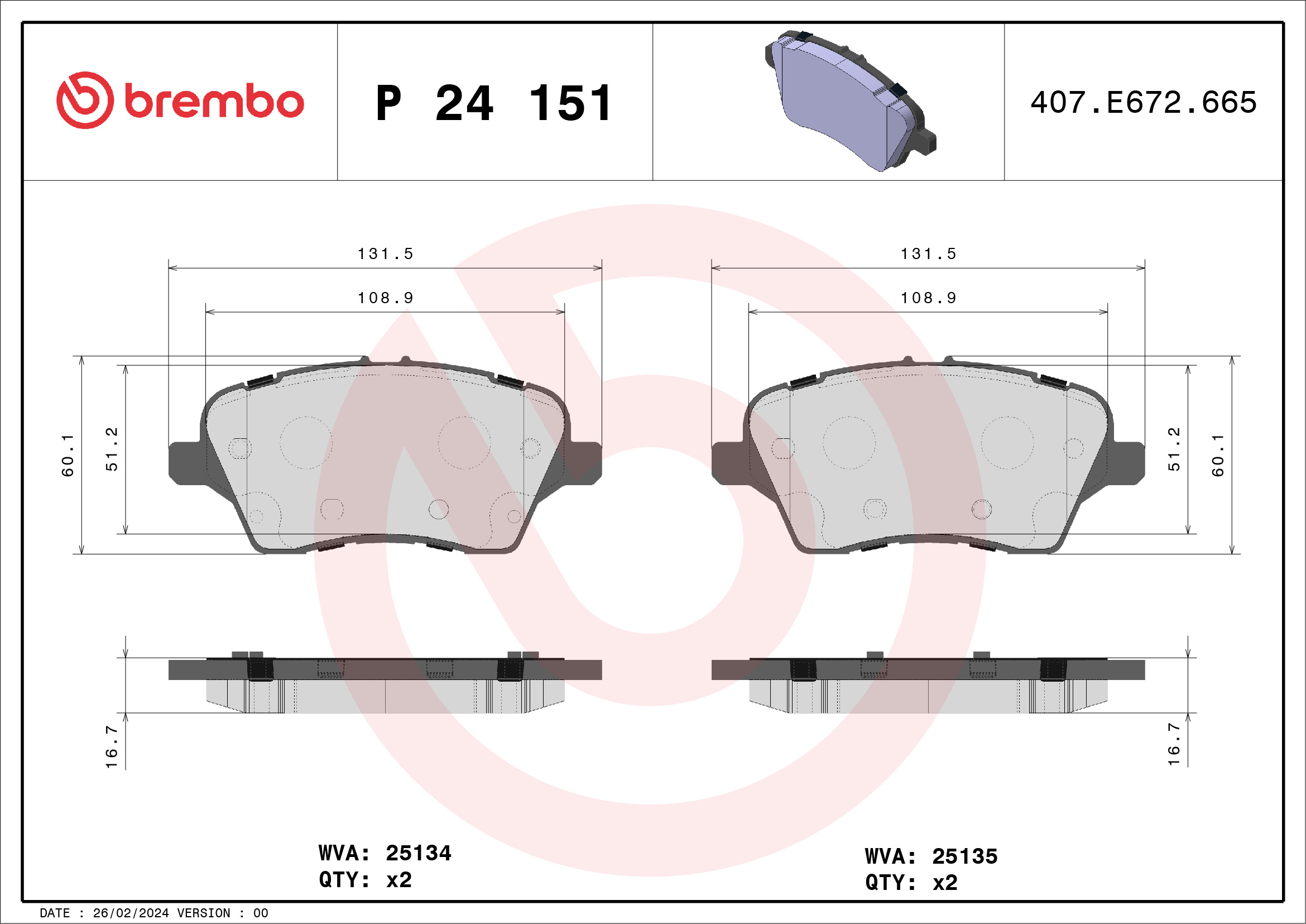 BREMBO P 24 151 - Sada brzdových destiček, vždy 4 kusy v sadě