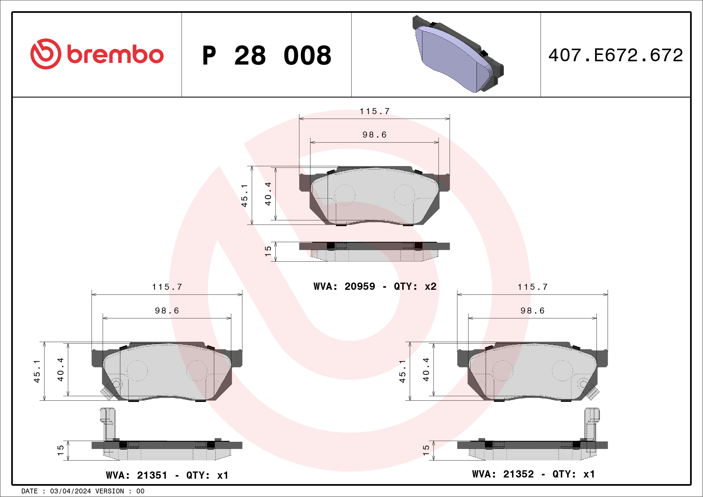 BREMBO P 28 008 - Sada brzdových destiček, vždy 4 kusy v sadě