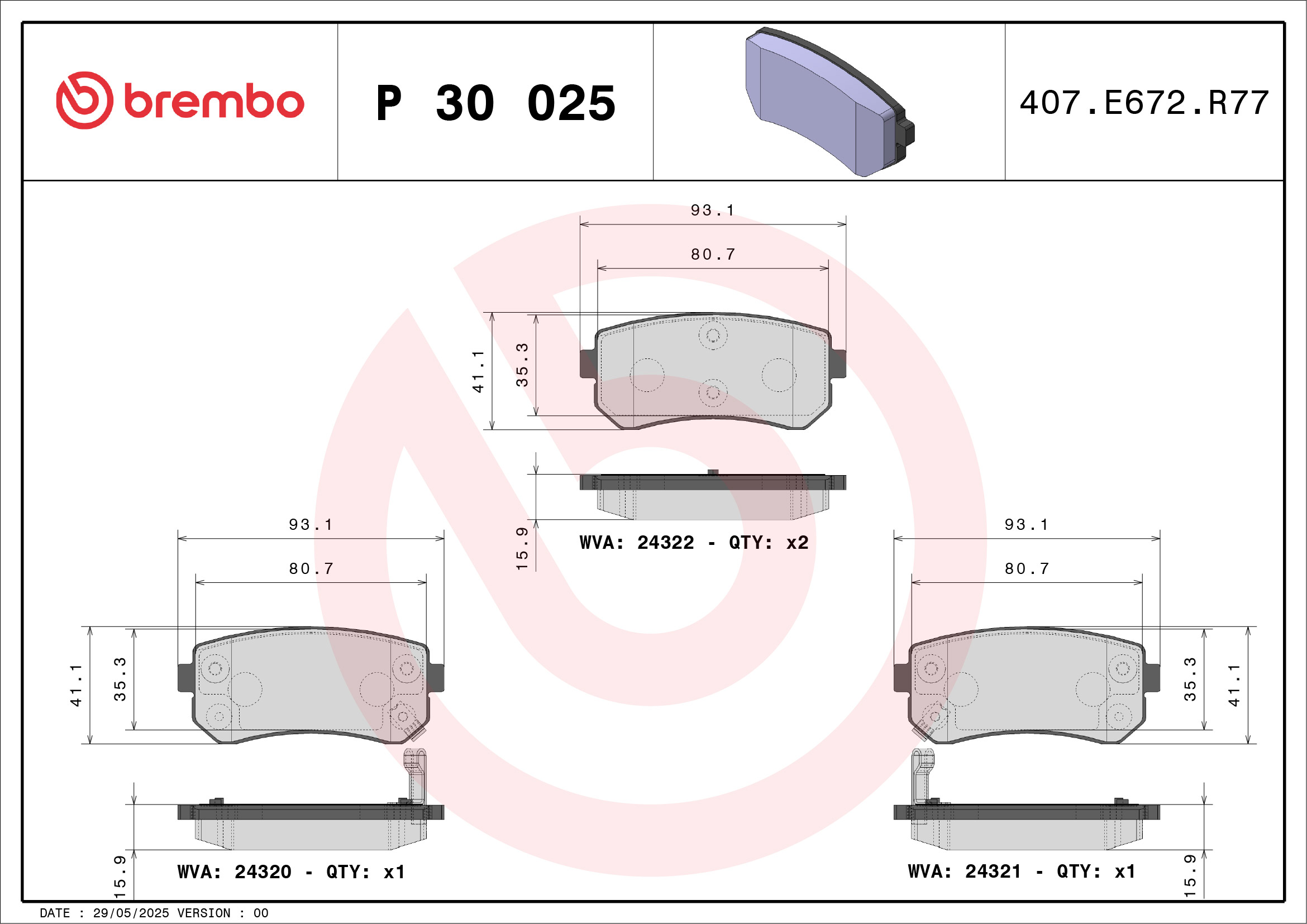 BREMBO P 30 025 - Sada brzdových destiček, vždy 4 kusy v sadě