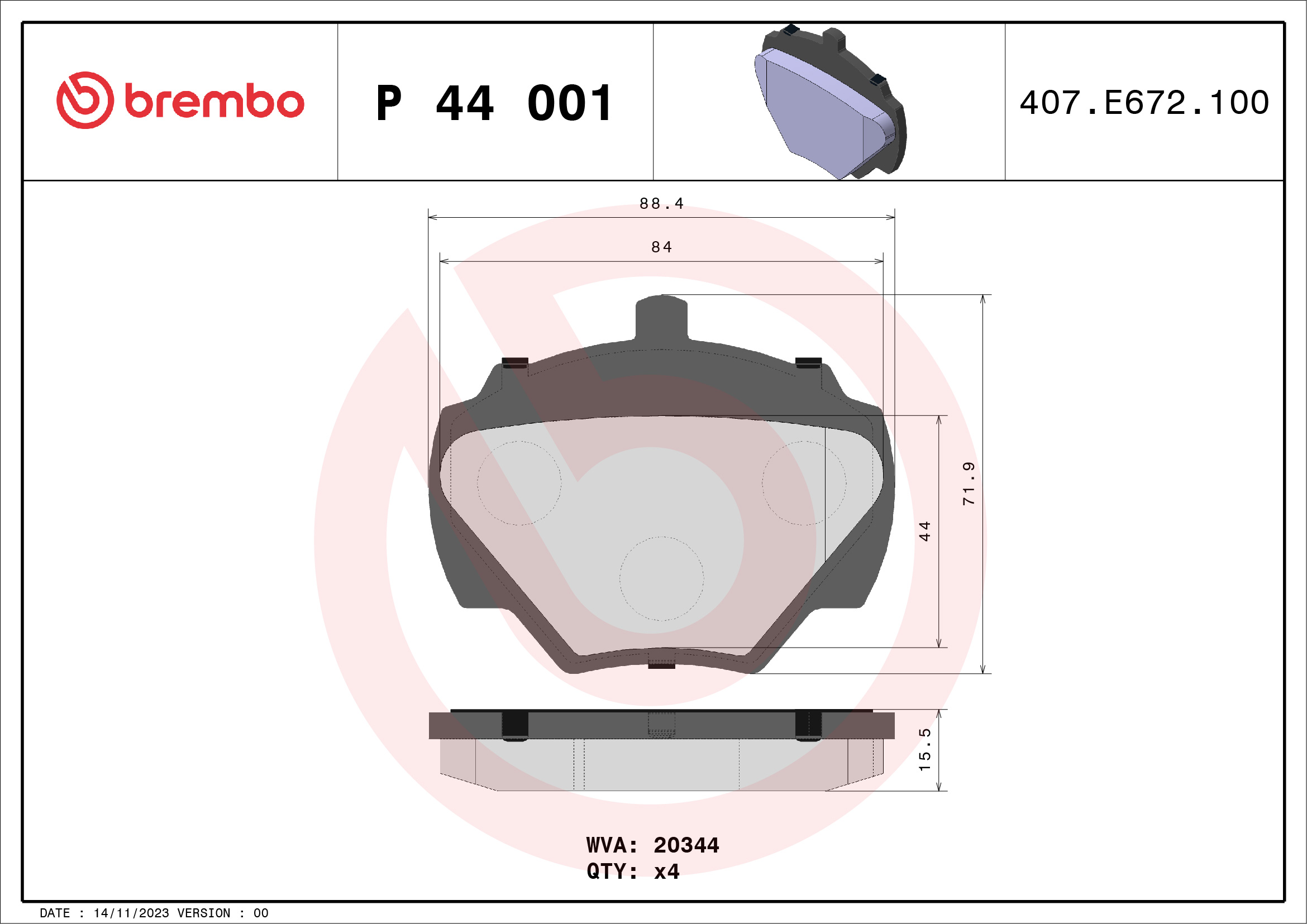 BREMBO P 44 001 - Sada brzdových destiček, vždy 4 kusy v sadě