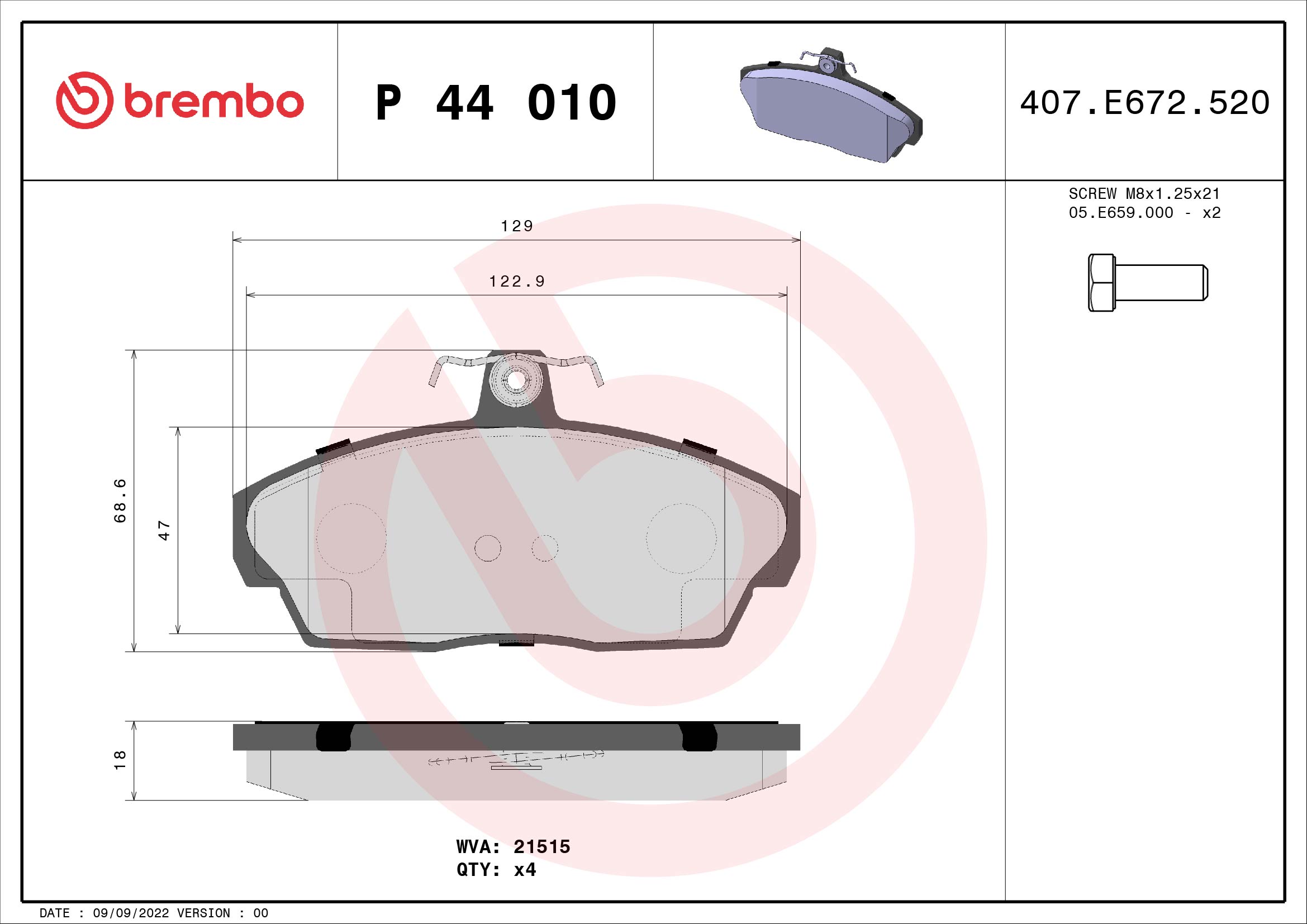 BREMBO P 44 010 - Sada brzdových destiček, vždy 4 kusy v sadě