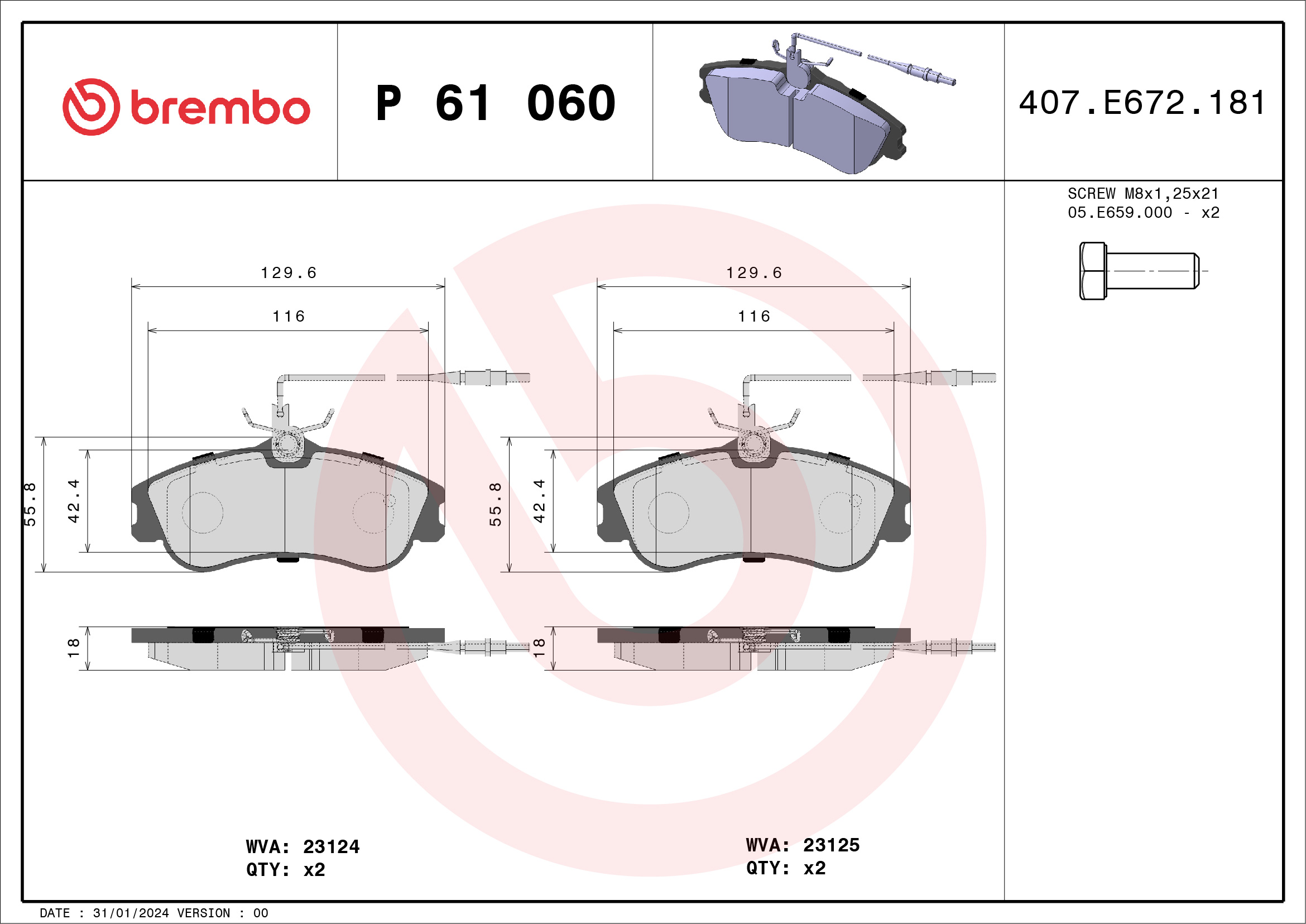 BREMBO P 61 060 - Sada brzdových destiček, vždy 4 kusy v sadě