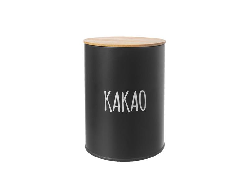 Dóza s víčkem na uložení kakaa.Vlastnosti:- Materiál: plech, bambus, silikon - těsnění- Rozměry: pr. 11 cm, v. 15,5 cm